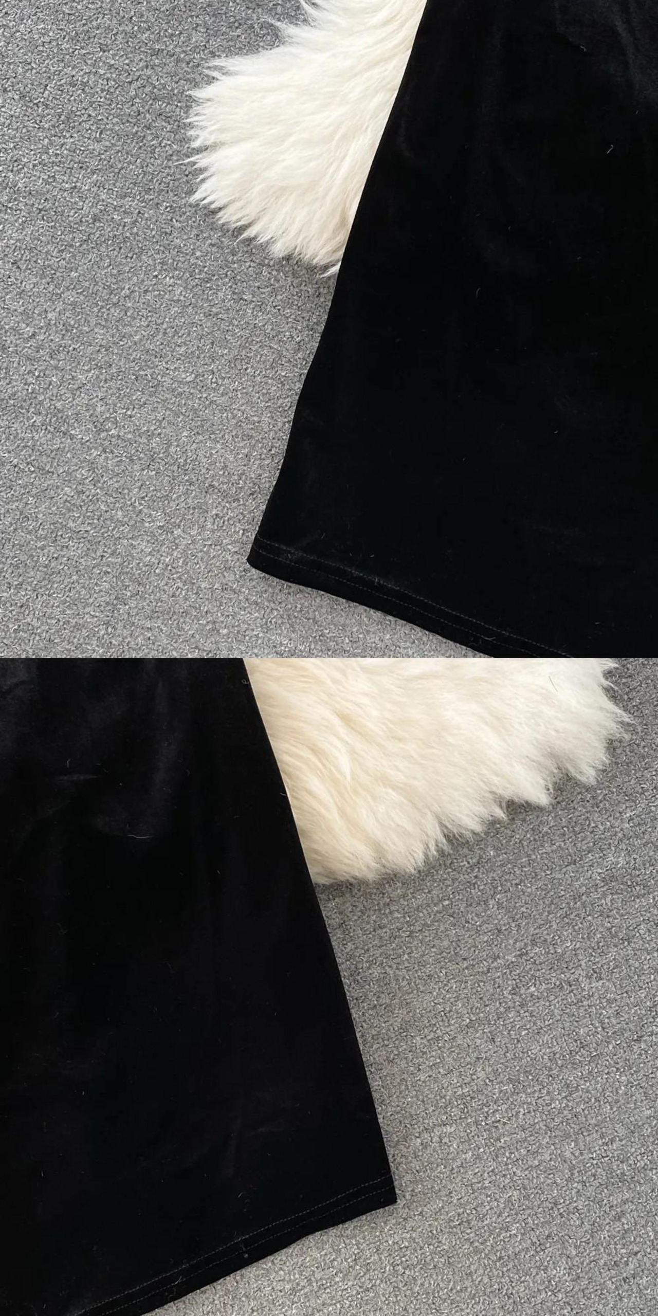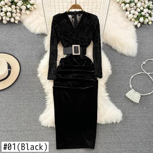 Vestidos es 秋プリーツウエストスリムボディコンローブペンシルドレス黒ベルベット ブラック オータム 秋物