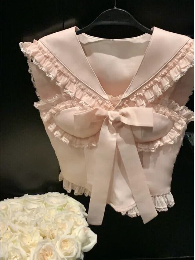 真菌甘いタンクトップかぎ針編みかわいいロパグランジネイビーネックボウトップ取り外し可能襟レースストラップキャミソール Tシャツピンクシャツ リボン 大人ガーリー スウィート キュート カジュアル
