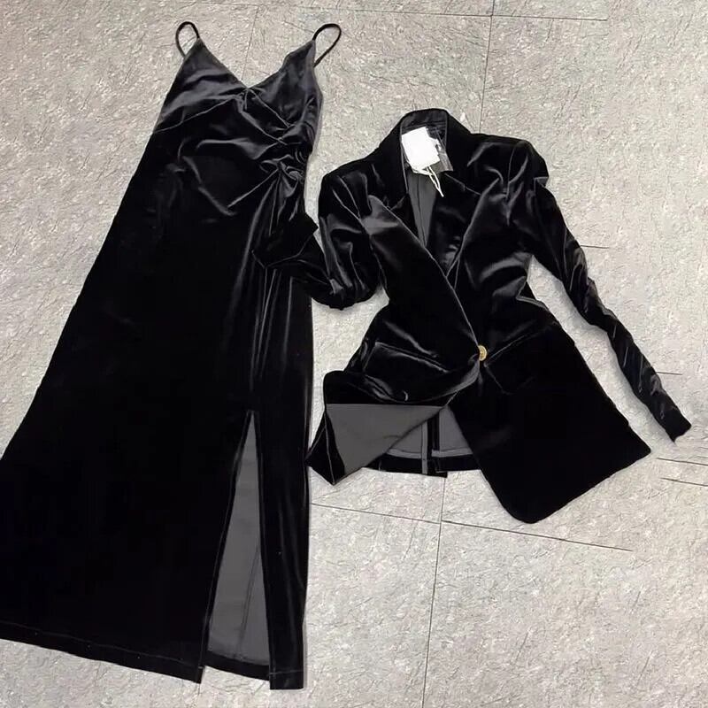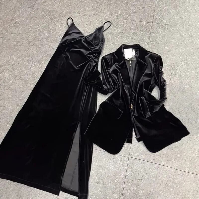 秋冬オーバーサイズスーツコートサスペンダーベルベットドレスストラップパーティープリーツ黒ブレザー生き抜く 2 点セット ブラック オータム 秋物 ウィンター 冬物