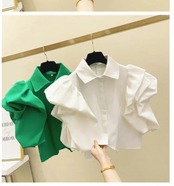 バブルスリーブシフォン半袖シャツクロップトップ白シャツ Camisa De Moda ショート ホワイト ハーフスリーブ