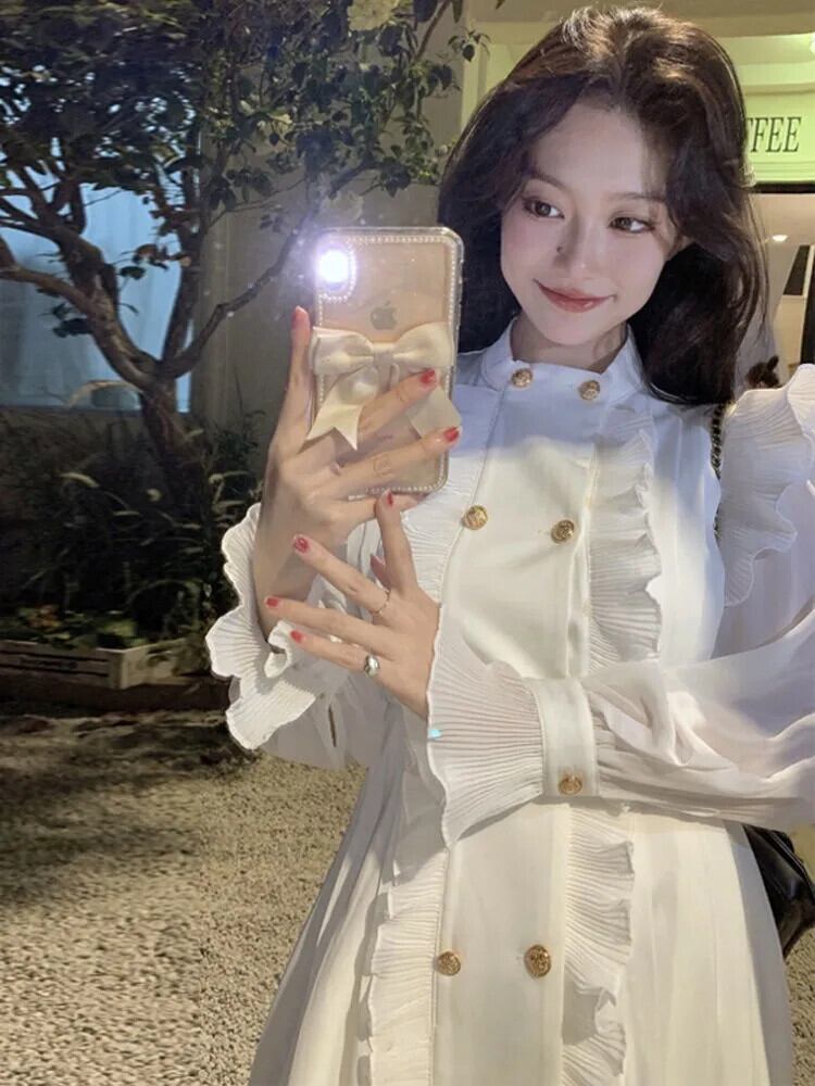 Vestidos de es スモールフレグランススタイルウエストラップスリムフレンチレトロダブルブレスト宮殿白いドレス ホワイト レース