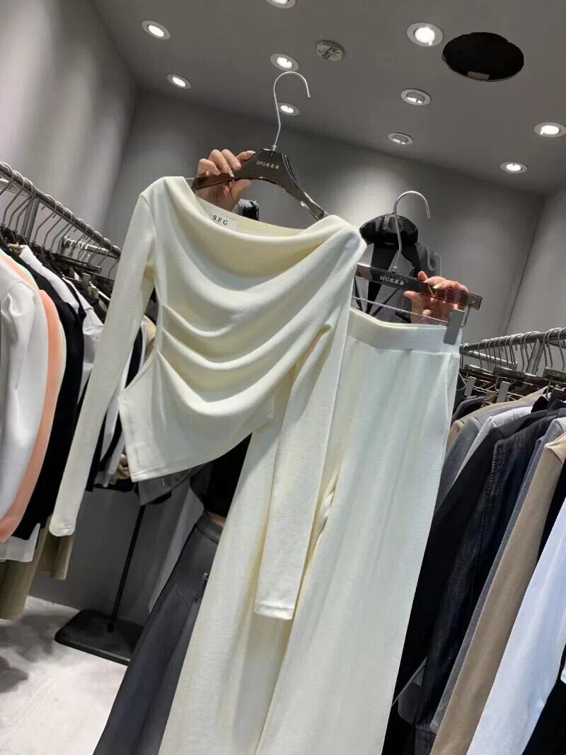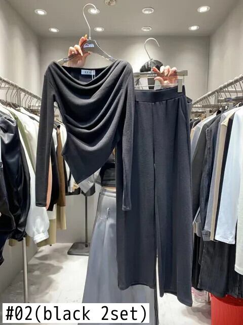 不規則ウエストオフショルダー T シャツ黒トップスウエストストレートパンツ 2 点セットトラックスーツワイドレッグニット ブラック ワイドパンツ Tシャツ ソリッドカラー