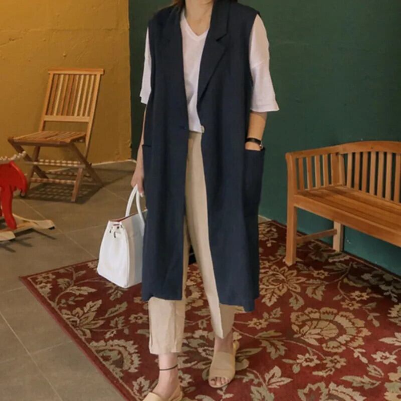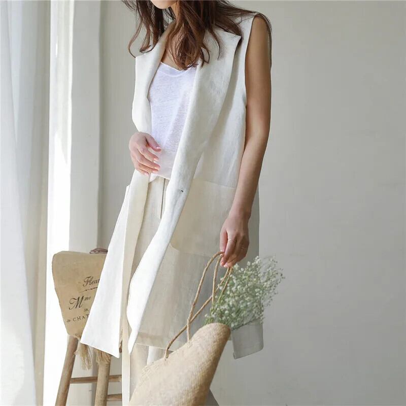 ブレザー Feminino シングルブレストルーズベストジャケット春夏白コットンリネンベストノースリーブブレザーチョッキ ホワイト スプリング 春物 サマー 夏物