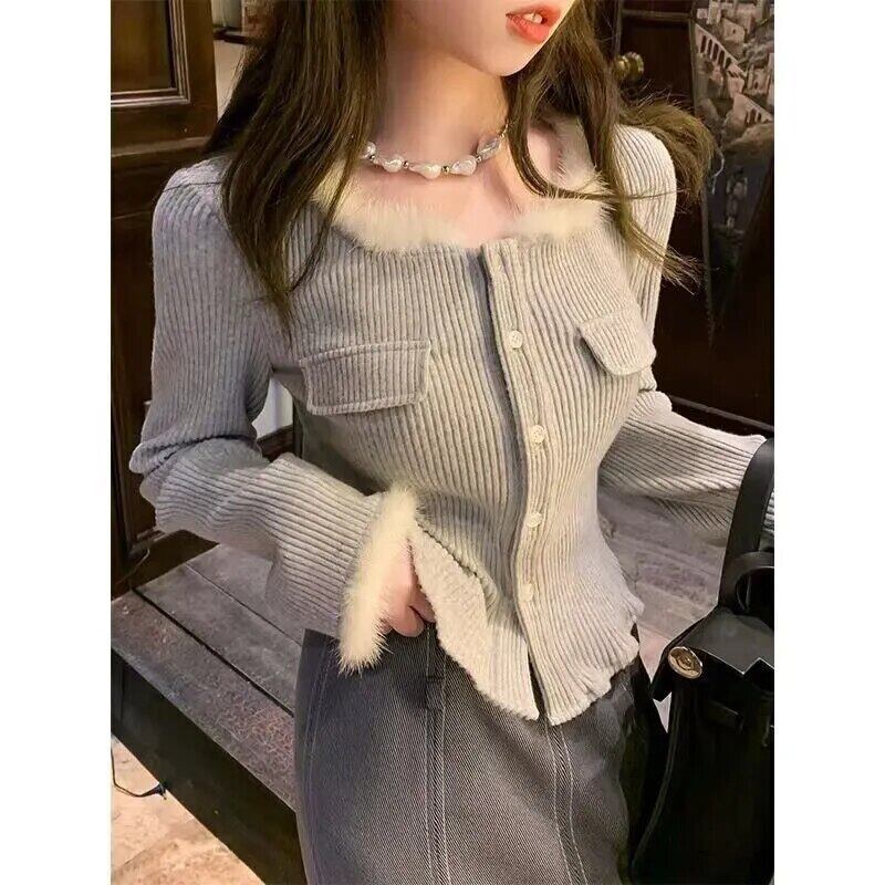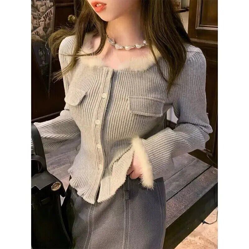 クロップドシングルブレストカーディガンファーネックスリーブ美的グランジロパデグラフィック Tシャツニットトップス Tシャツ