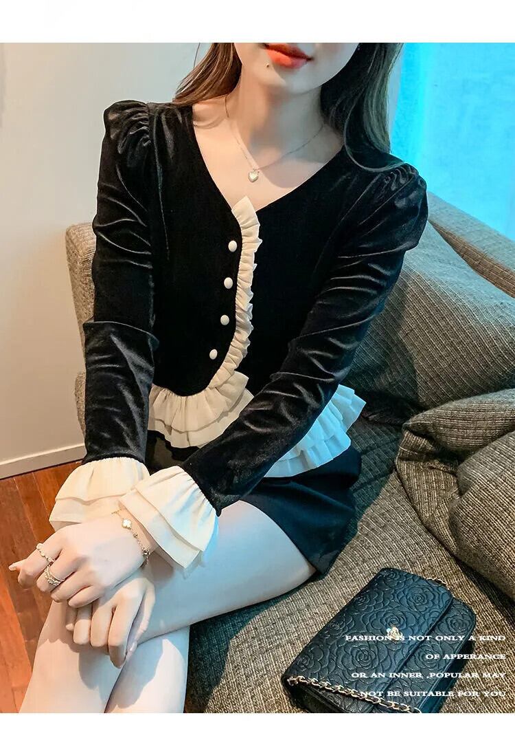 Vネックフリルエッジバブルスリーブゴールドベルベットシャツショートスタイル気質レースシャツクロップトップス