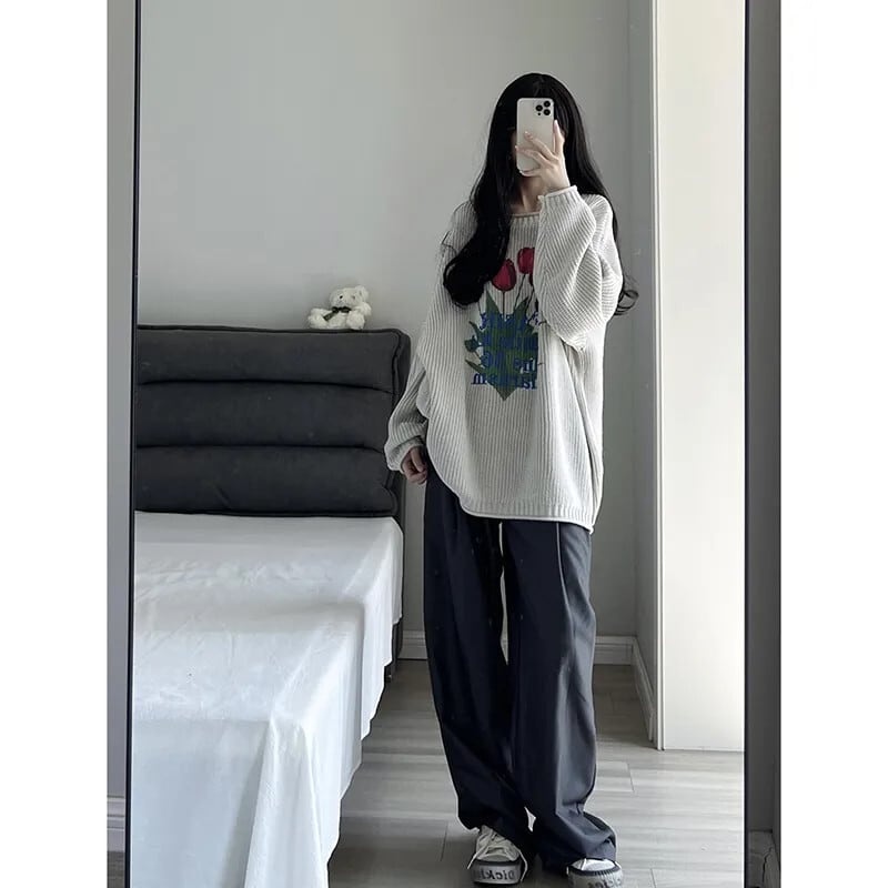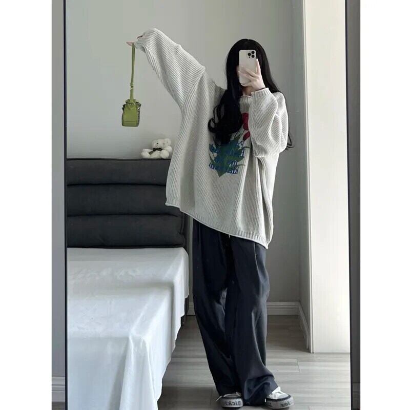 Y2K ニットセーターレトロ原宿花柄プルオーバー秋冬ルーズ長袖 O ネックニットトップス ロング かわいい オータム 秋物 ウィンター 冬物 Oネック