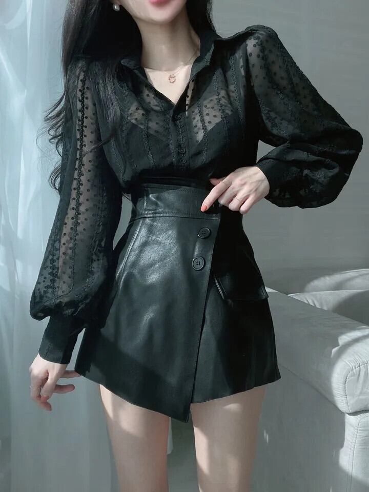 ルーズ Blusa 黒視点シャツカミーサブラウスシックトップスシャツ ブラック