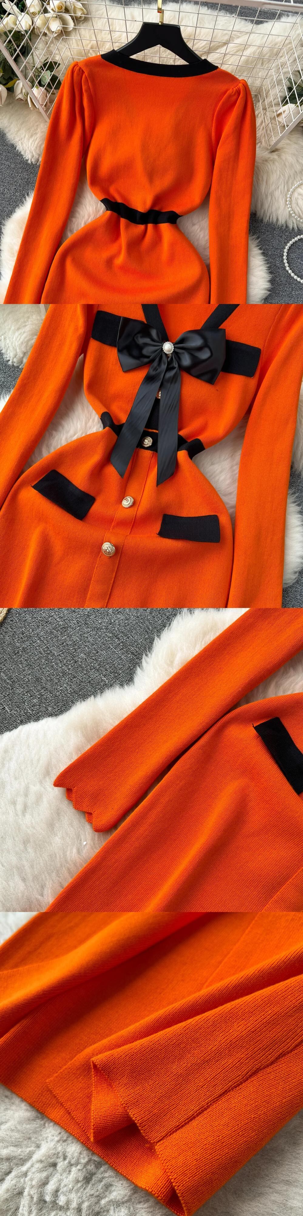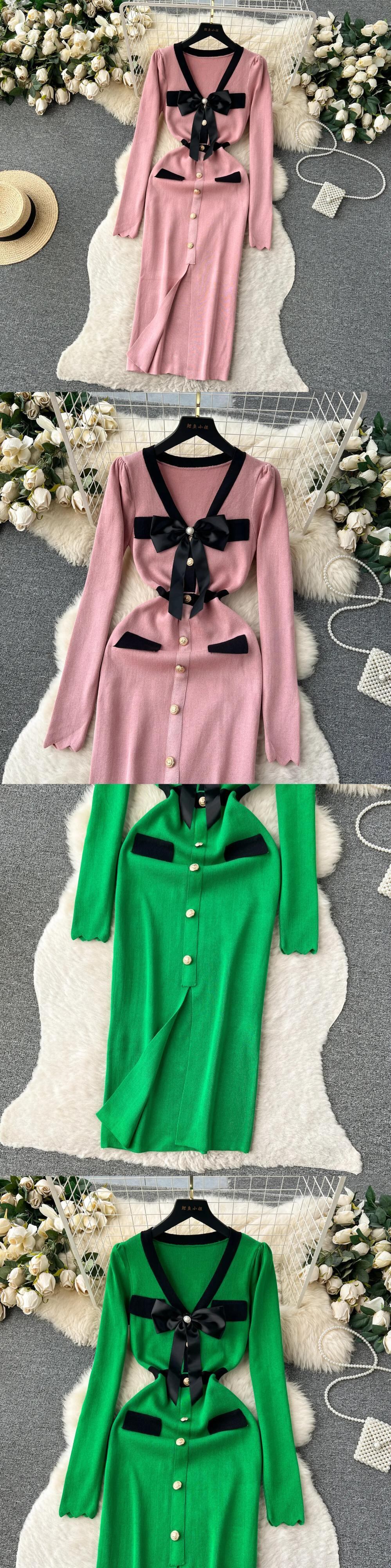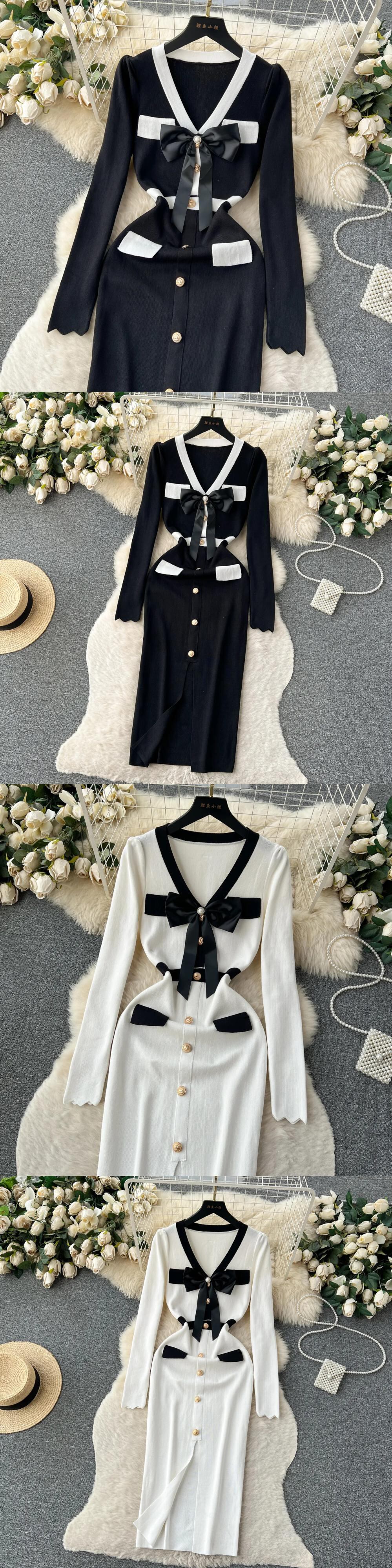 ドレス Vestidos デスリム V ネックシングルブレストボディコンドレスセーター秋ニットドレス Y2k 弓 リボン オータム 秋物 Vネック