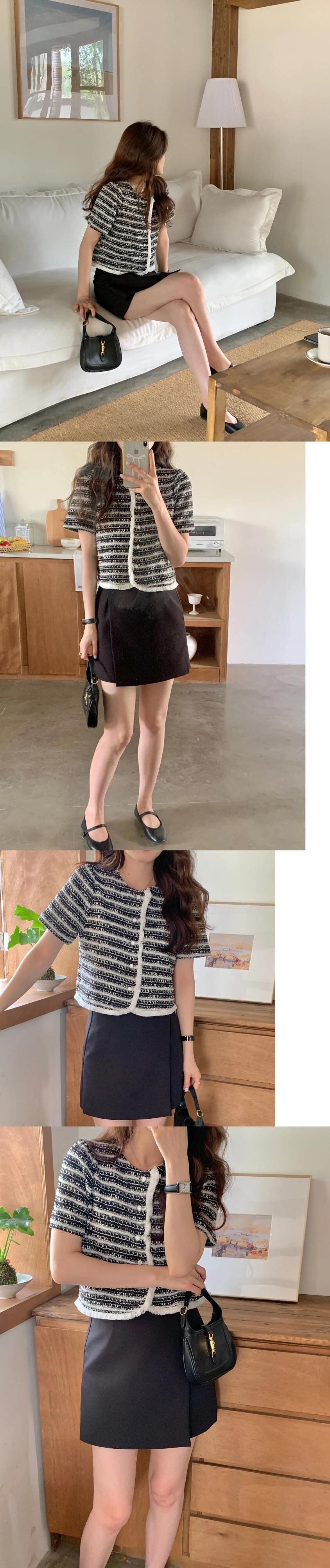 O ネック パール シングル ブレスト ルーズ 多目的 ブラック ホワイト Tel ショート ジャケット チャケータ クロップ ストライプ カーディガン シャツ 真珠