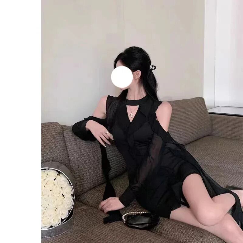 Y2k ドレス Vestidos デ パーティー スリム ボヘミアン ドレス セクシー黒オフショルダー ハンギング ネック ドレスフリル ブラック