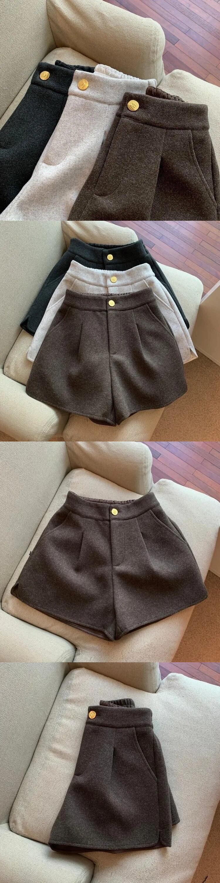 スプリットワイドレッグ秋冬黒肥厚ウールショートパンツショート Y2k ショーツ ブラック オータム 秋物 ウィンター 冬物 ブルマー ワイドパンツ