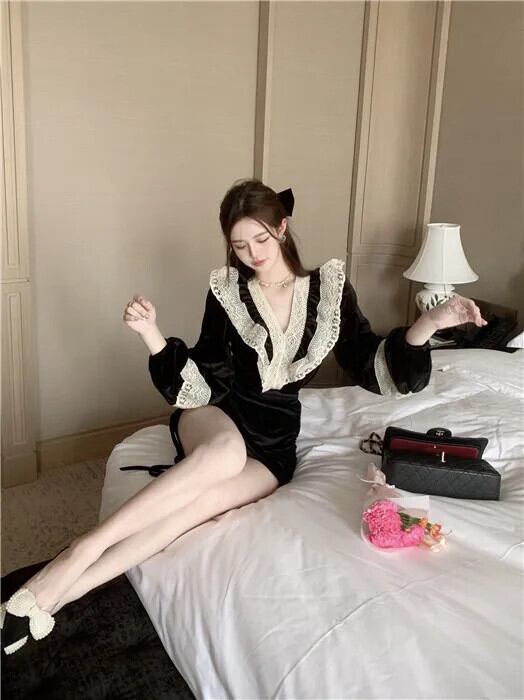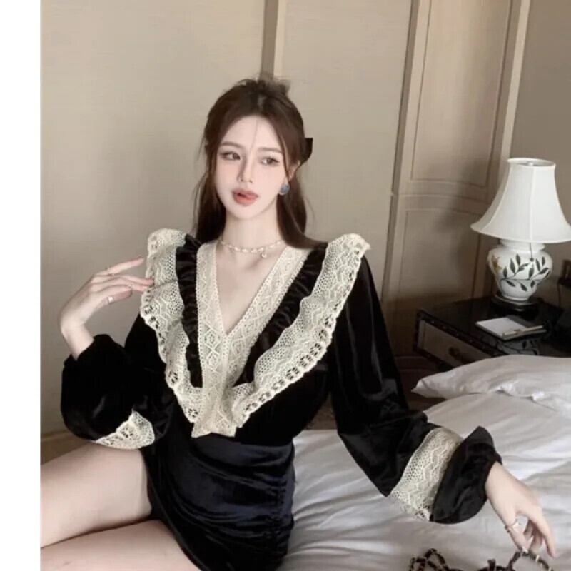ブラウス レディース 秋 フレンチ スタイル レース レトロ ブラック ベルベット シャツ センス スモール シック トップ シャツ オータム 秋物