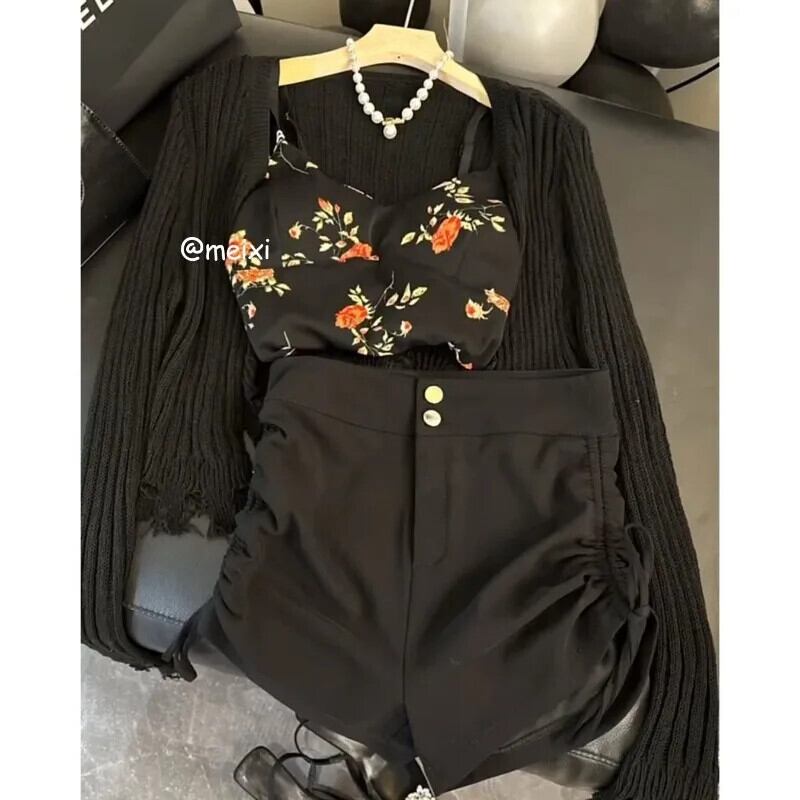 ショートセット巾着ショーツセクシーワイドレッグショートパンツ春スリムタンクプリントキャミソールシャツクロップブラックカーディガン3セット スプリング 春物 ブルマー ワイドパンツ