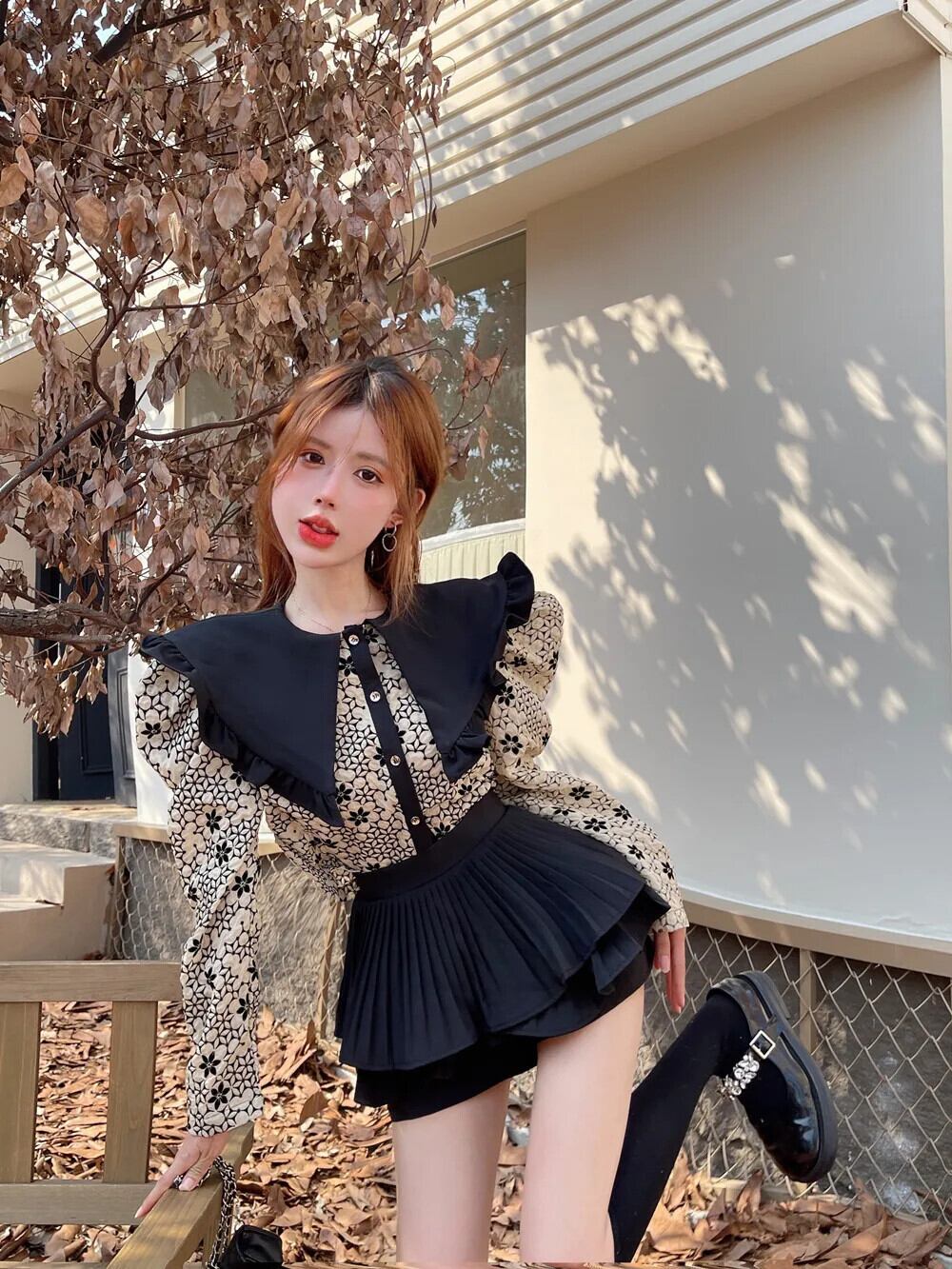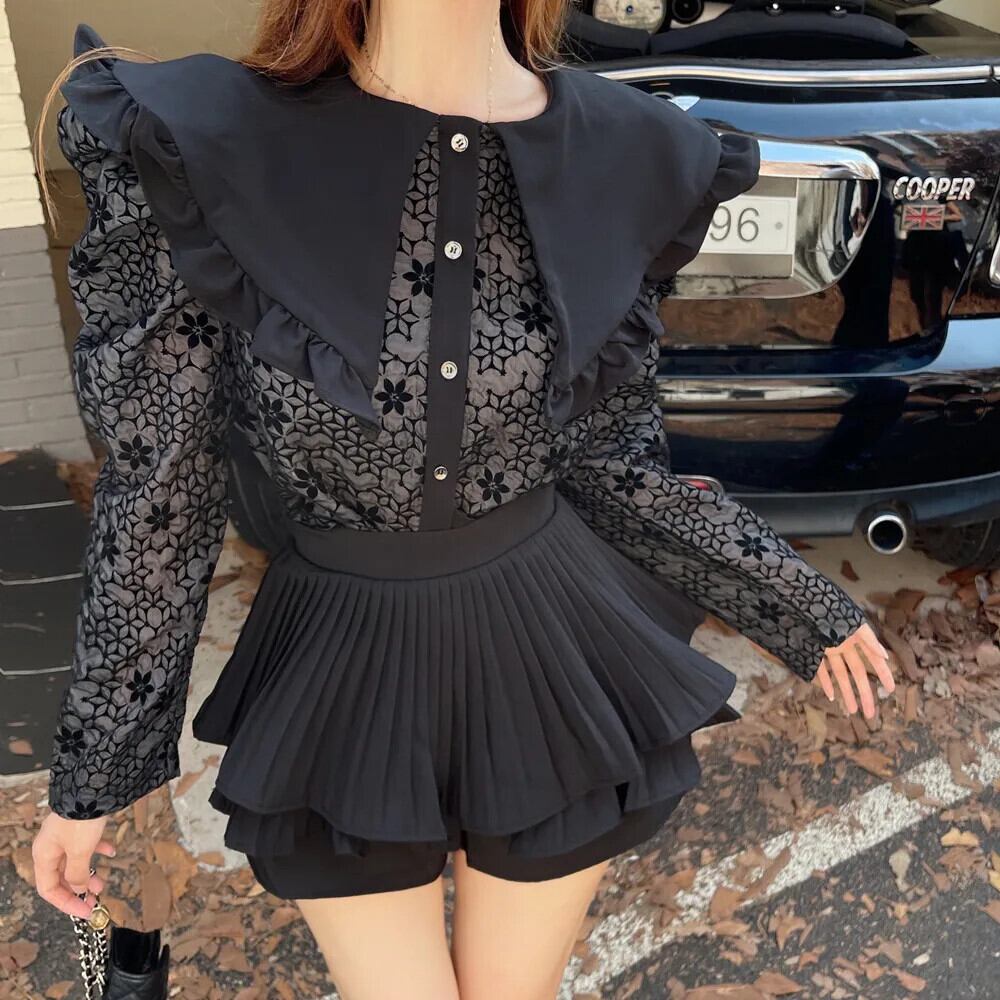 パレススタイル ドールカラーシャツ 刺繍入りジャカード クロップトップ ブラック 花柄シャツ ブラウス シャツ レッド レース