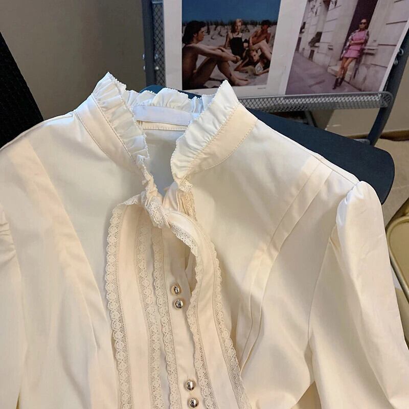 真菌宮殿スタイルリボンブラウス秋ボトム長袖トップデシャツシャツ ロング レース オータム 秋物