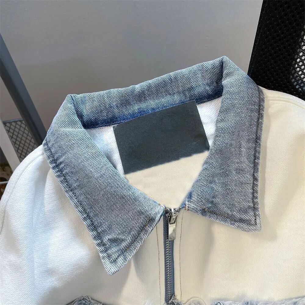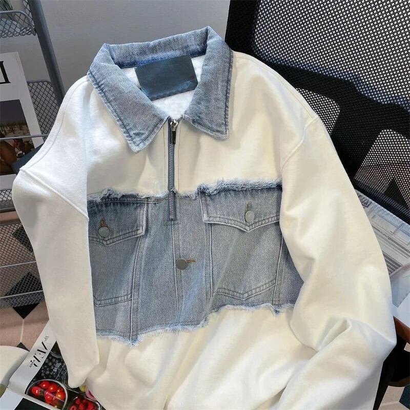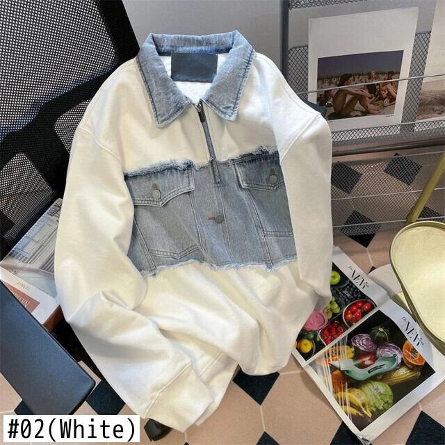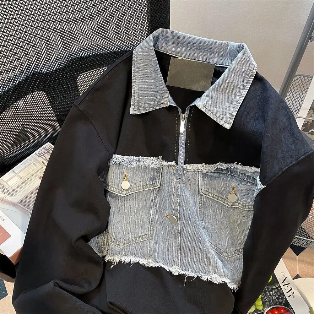 ストリートデニムシャツユニセックスヒップホップ長袖トレーナー春秋ルーズレトロラペルハーフジッパートップデニムトップス ロング スプリング 春物 オータム 秋物
