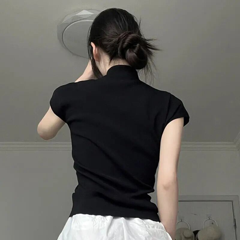 スリムフィットコットン半袖 Tシャツスタンドネックフライングスリーブチャイナクロップトップス Y2k ブラックグラフィック Tシャツ Ropa グランジ ショート ハーフスリーブ