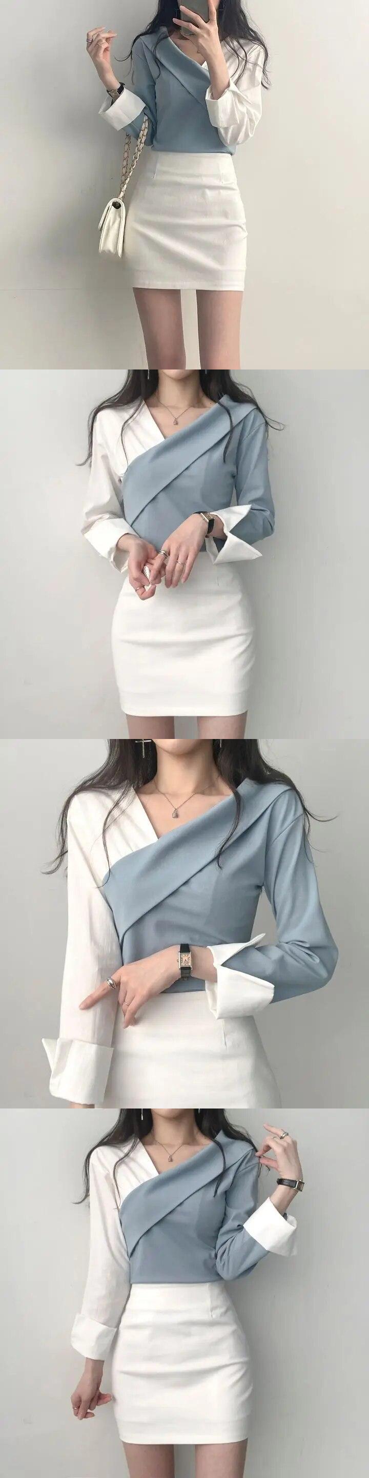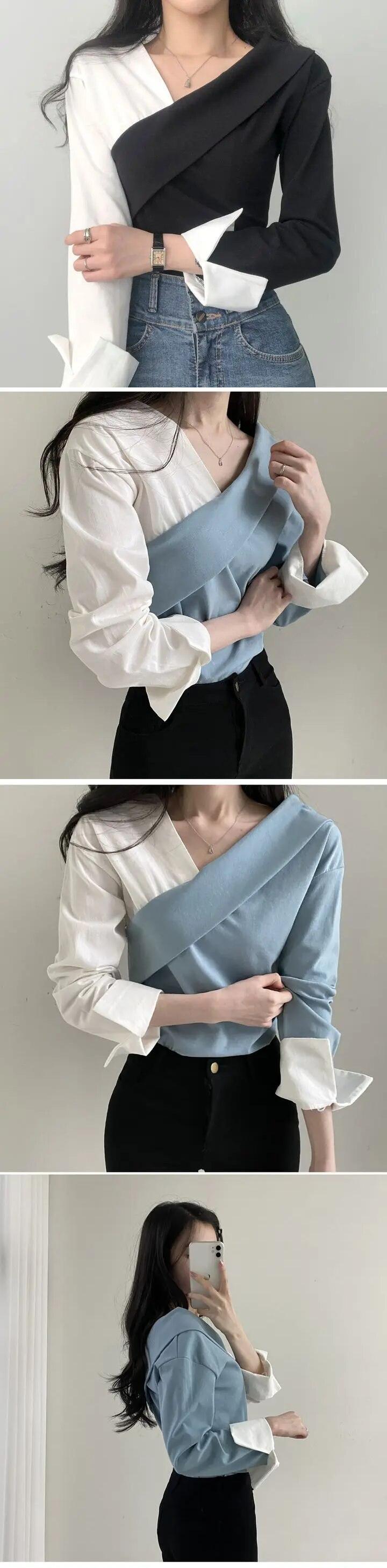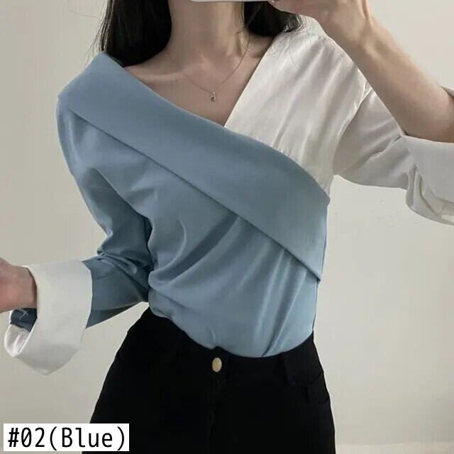 Y2k ノッチ付きレディーストップスシックコントラスト長袖プルオーバーパーティースリムオールマッチシックシャツ Ropa Tシャツ ロング