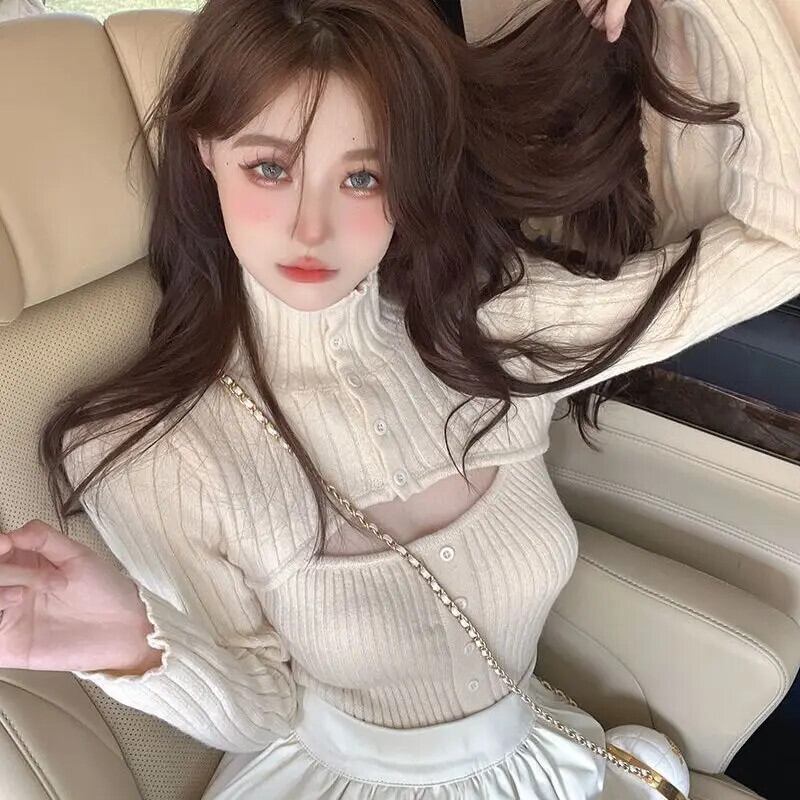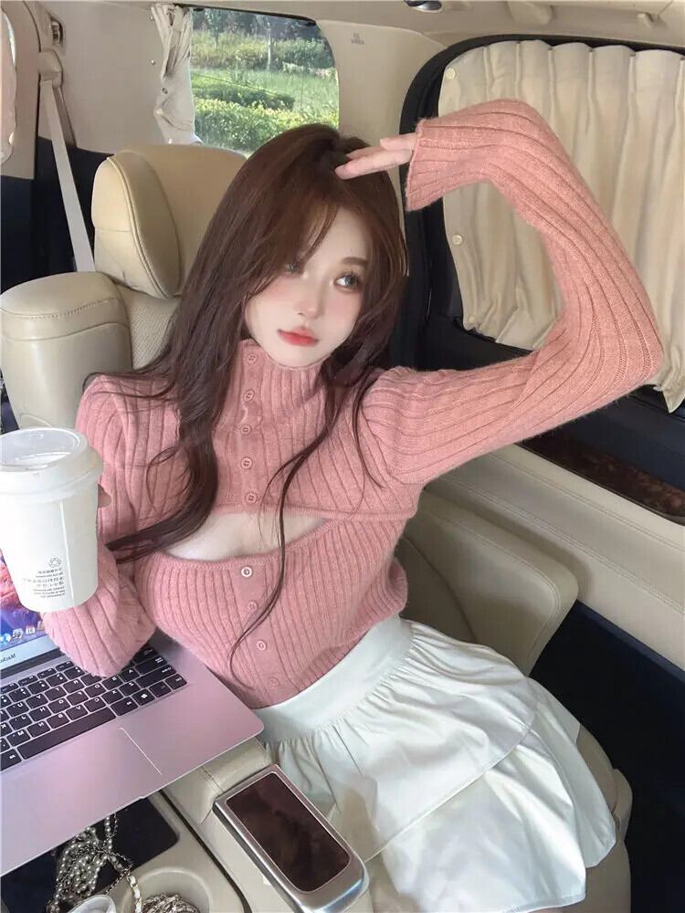 セータースリムフィットボトムトッププルオーバー偽ツーピースネックセーター美学グランジピンク Tシャツボタンセクシー