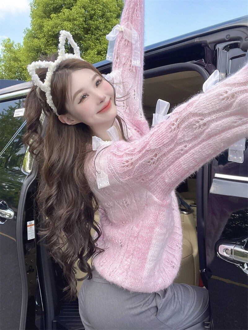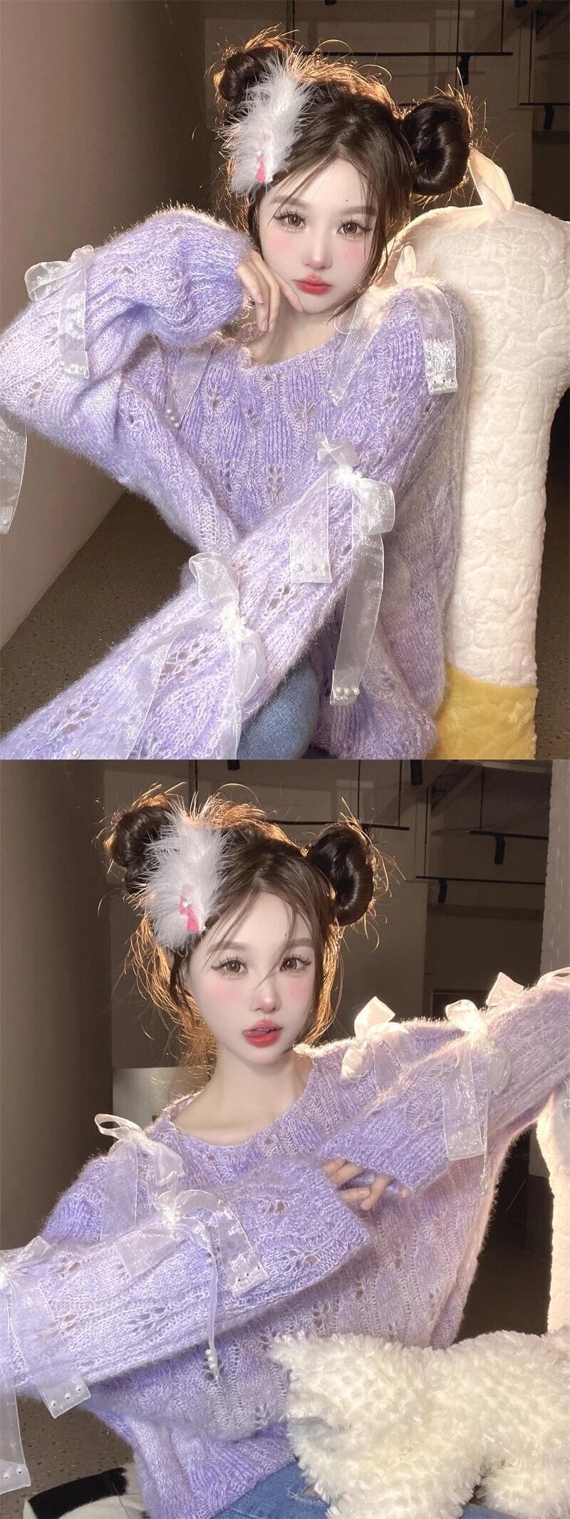 セーターボウアウターニットトップクロップドセータートップス甘いジャンパープルニットグランジ リボン 大人ガーリー スウィート キュート カジュアル
