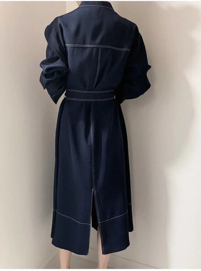 ベルトウエストミニマリストスタンドオープンラインシングルブレストルーズストラップウインドブレーカースタイルドレスミッドレングストレンチロングドレス ハーネス