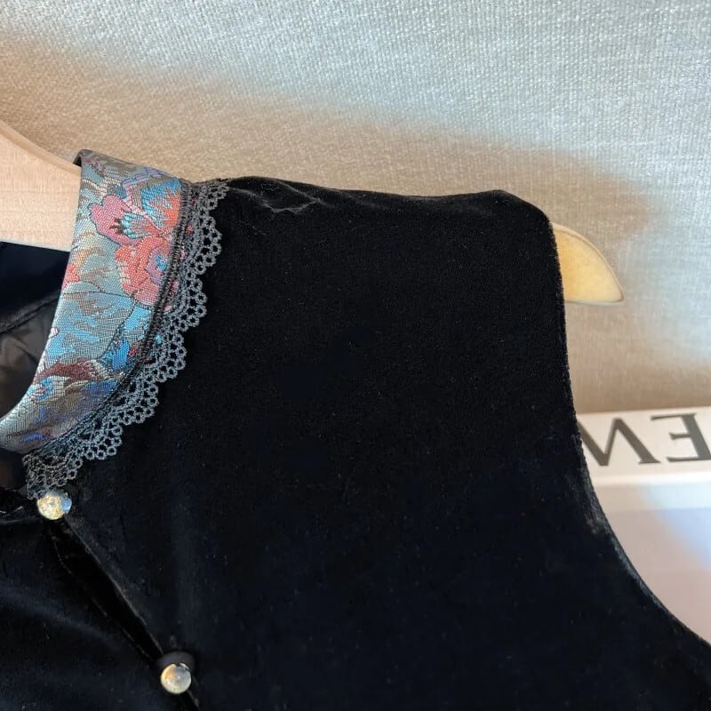 黒ベルベットベストコート Colete Feminino ベストクロップトップ刺繍プリントジャケットチョッキ Chaleco ブラック