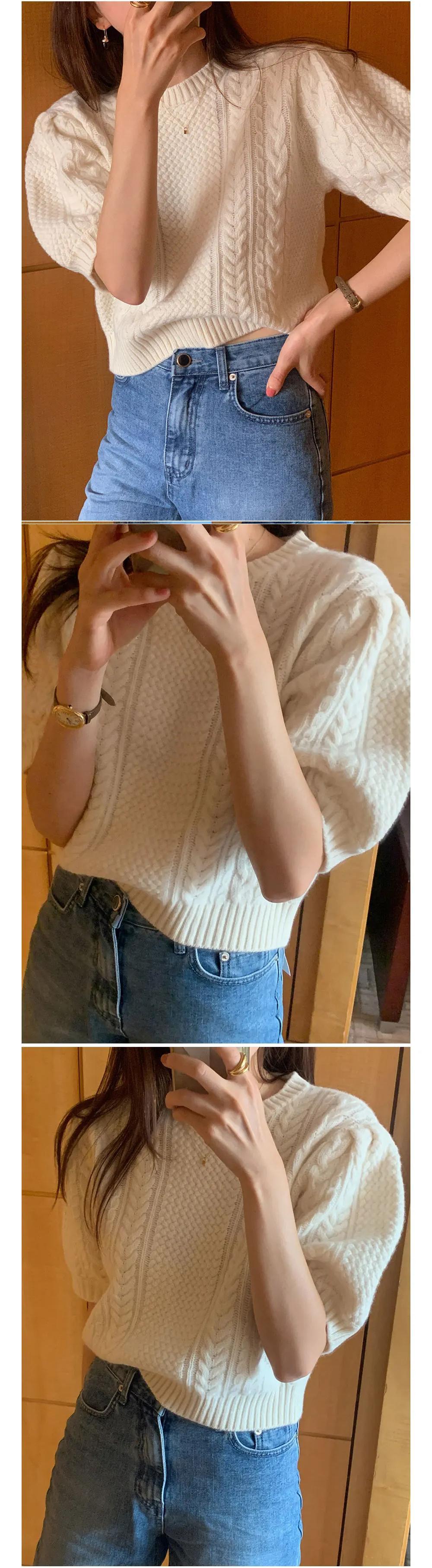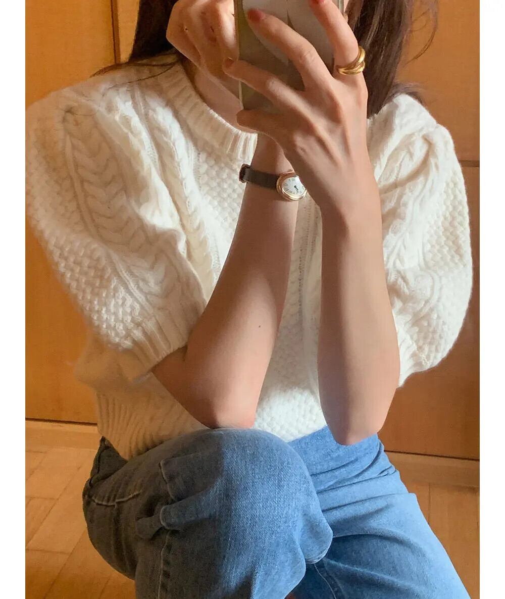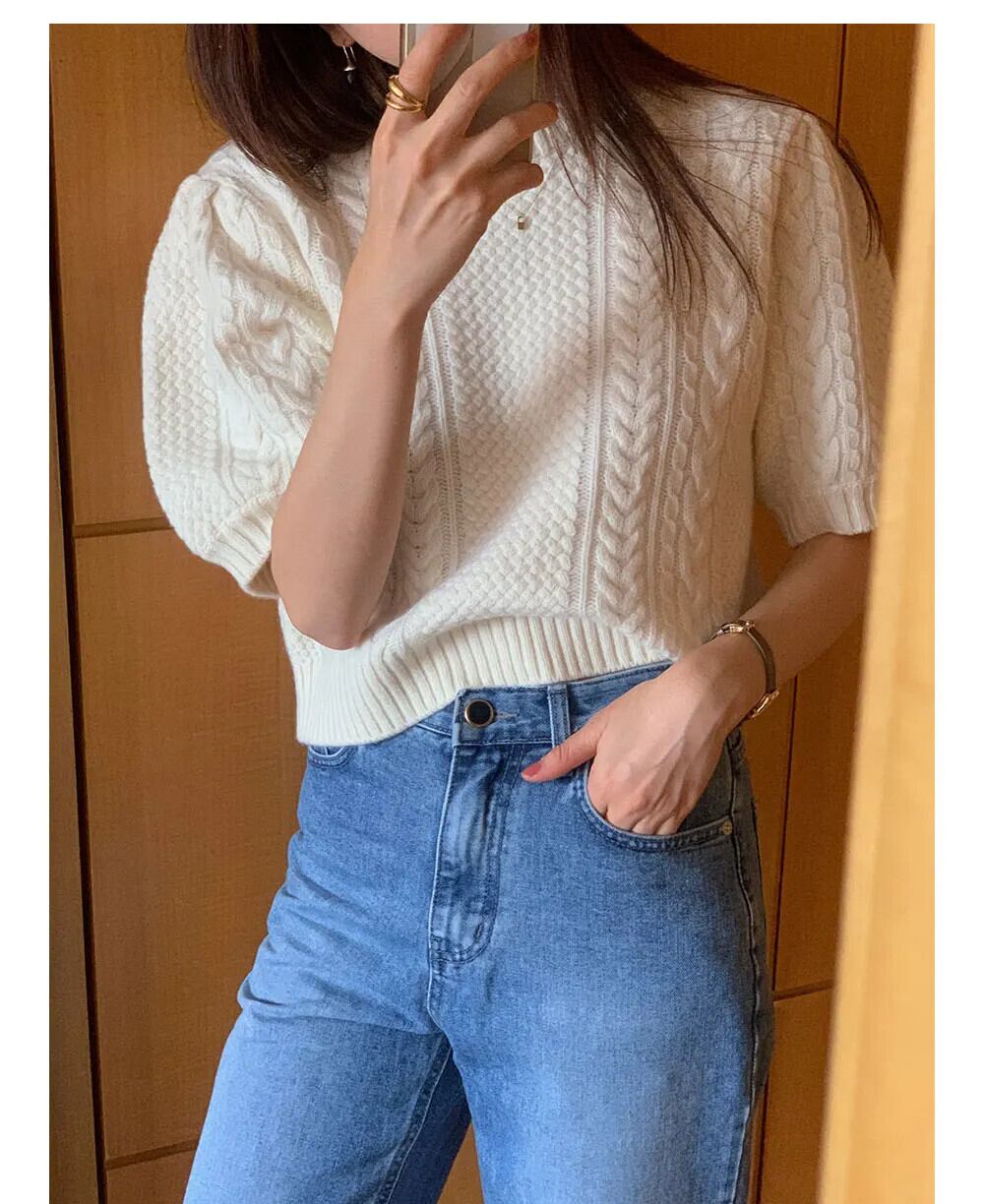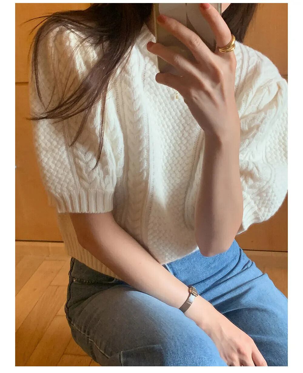 ルーズ無地スリーブニットセーター春フレンチスタイルラウンドネックショートツイストセータートップスジャンパー スプリング 春物 Oネック ソリッドカラー
