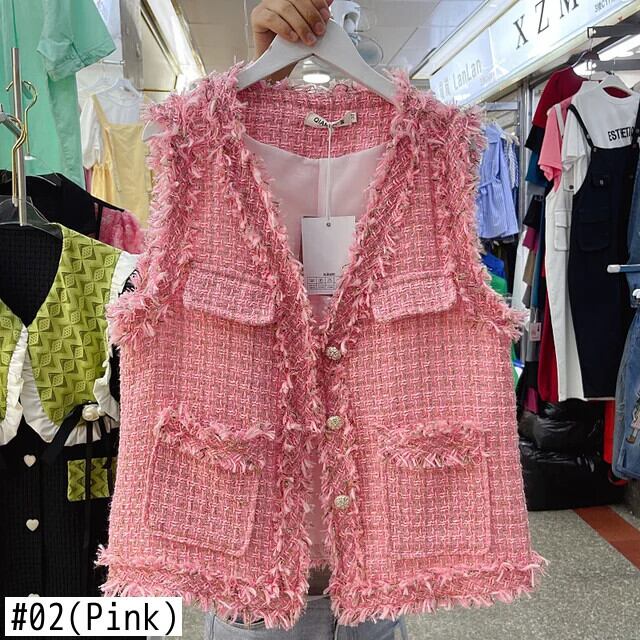 ピンク V ネックノースリーブツイードシングルブレスト Tel ベストチョッキ気質コート白タンクトップ ホワイト Vネック