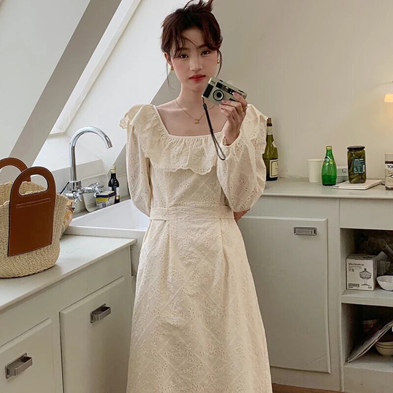 スクエアネックくり抜き刺繍フラワーレースアップ長袖ドレス Vestido コートスタイル ロング レッド フラワーデザイン スクウェア