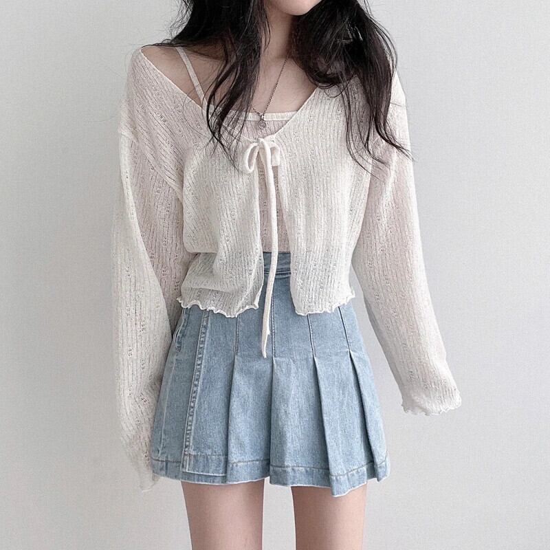 薄い日焼け止めカーディガンレースアップニットトップス夏スタイルランタンスリーブショートコート太陽保護 サマー 夏物