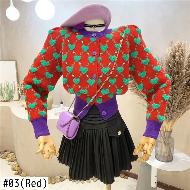 コントラストハートジャカードセーターセーターデニットカーディガントップス Y2k クロップドカーディガンラブコート