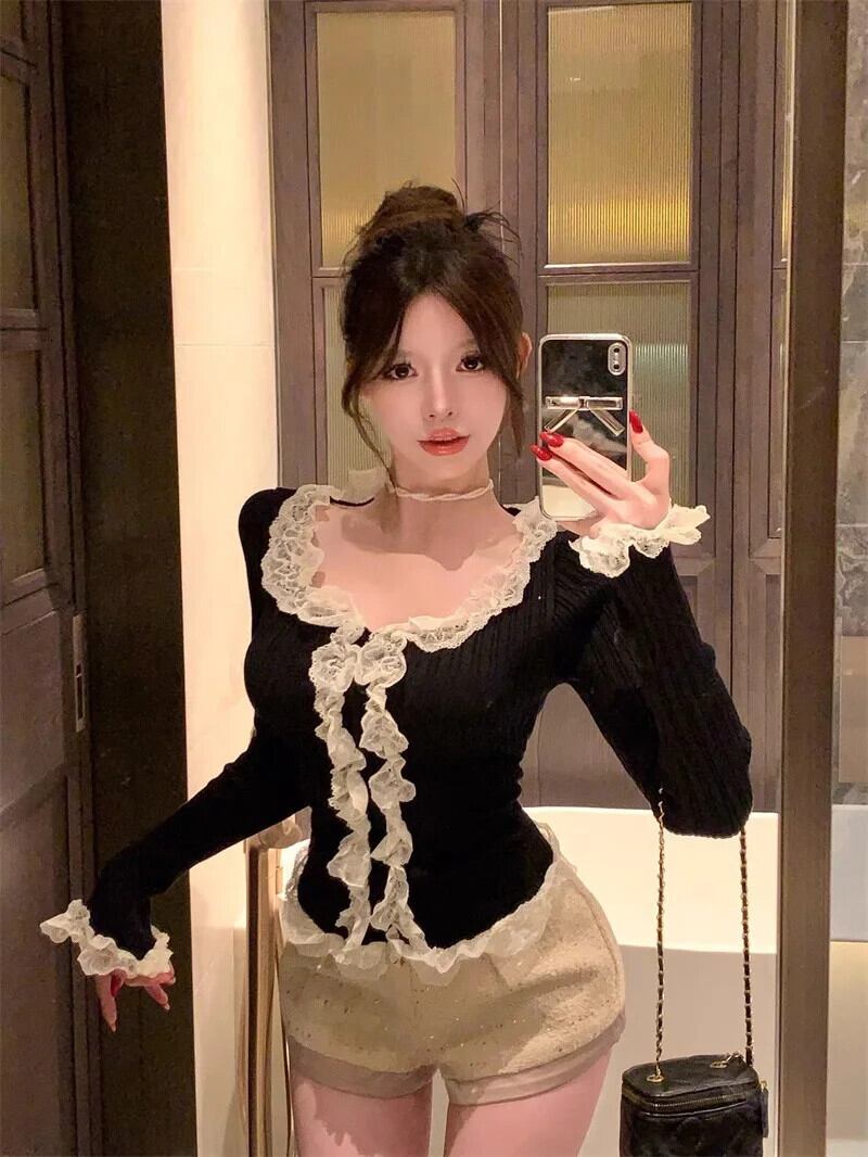 スリムレトロ Y2k トップ木製耳エッジプルオーバーセーターセータープルニットセーター美学グランジレースシャツ