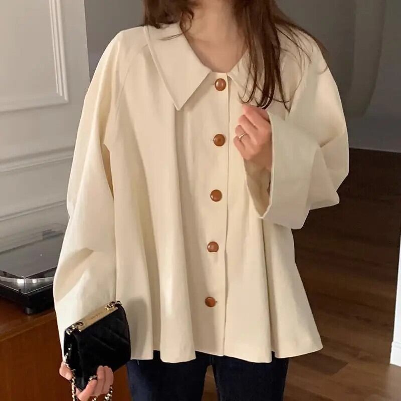 ラペルオーバーサイズルーズソリッドカラー長袖シャツトップブラウス人形シャツシックシャツ ロング