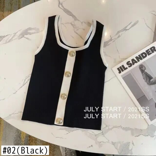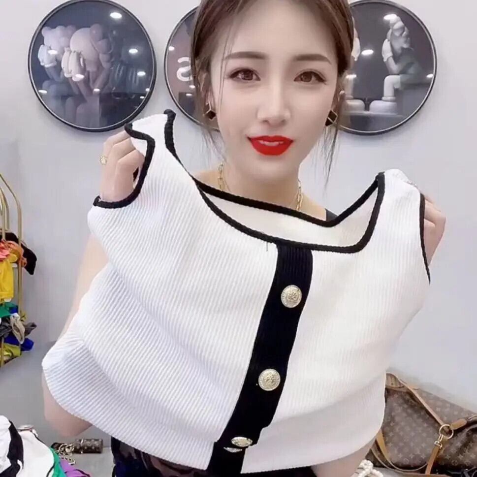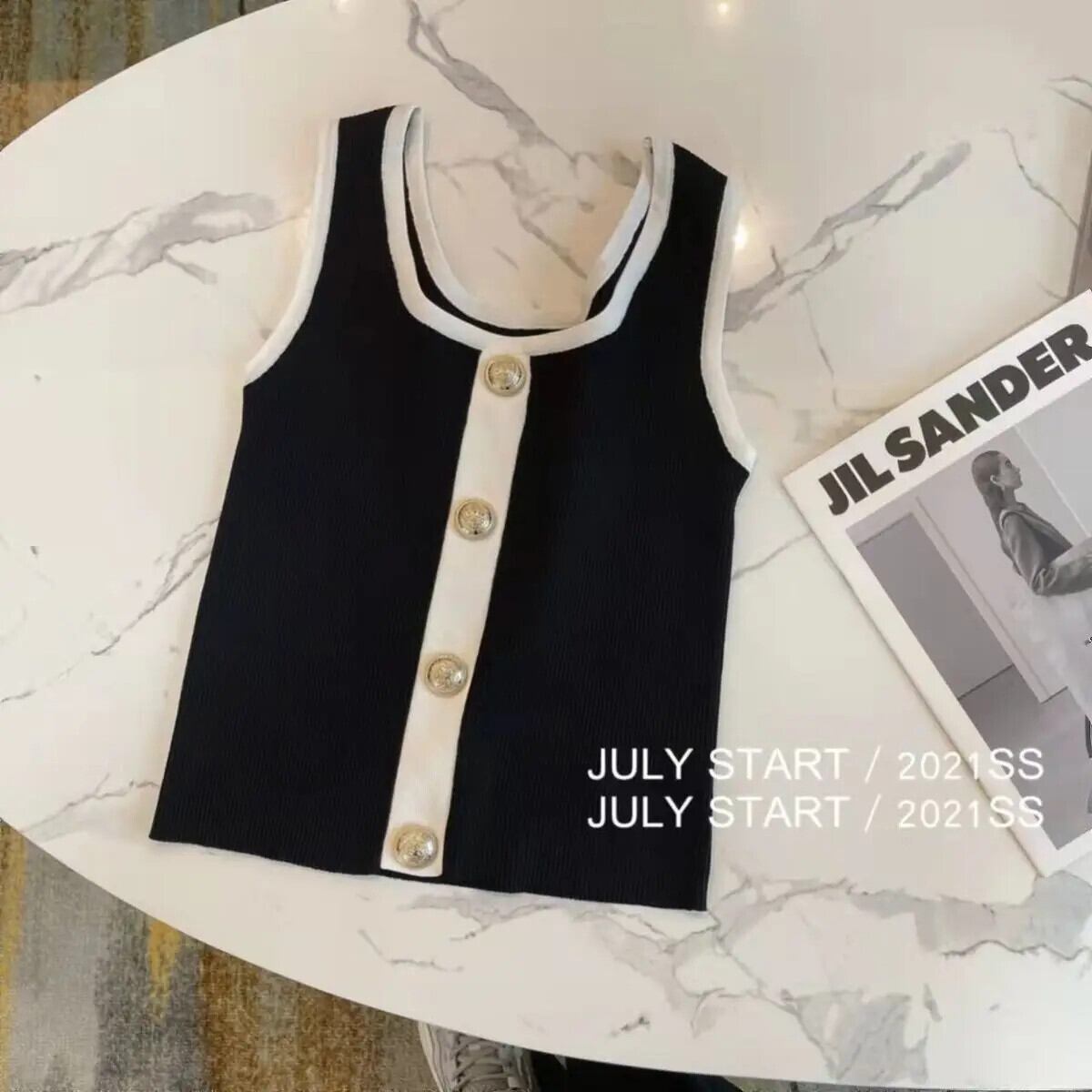パッチワークタンクトップシックボタン美的ルーズキャミソールサマーニット Y2k トップス黒ベスト ブラック 夏物