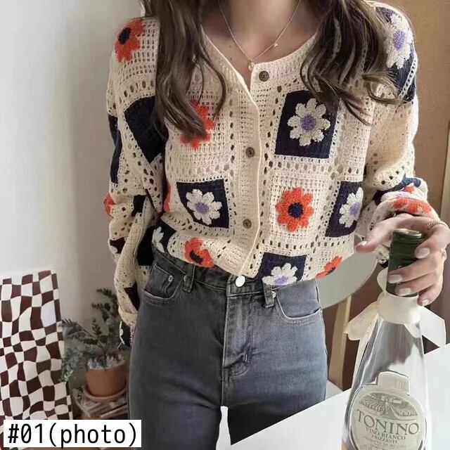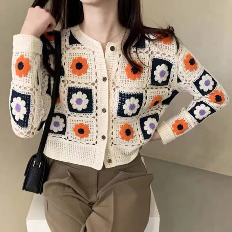 秋かぎ針編みカーディガンマルチカラー Y2k ニットセーター長袖ルーズコート暖かいセーター色トップス ロング