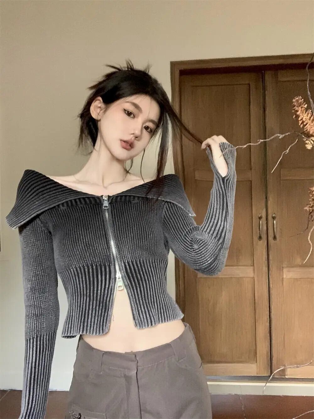 原宿秋カーディガンジッパースラッシュネック居心地良いセーターニット上着フレアスリーブ 2000 年代美的トップ かわいい オータム 秋物 ソリッドカラー