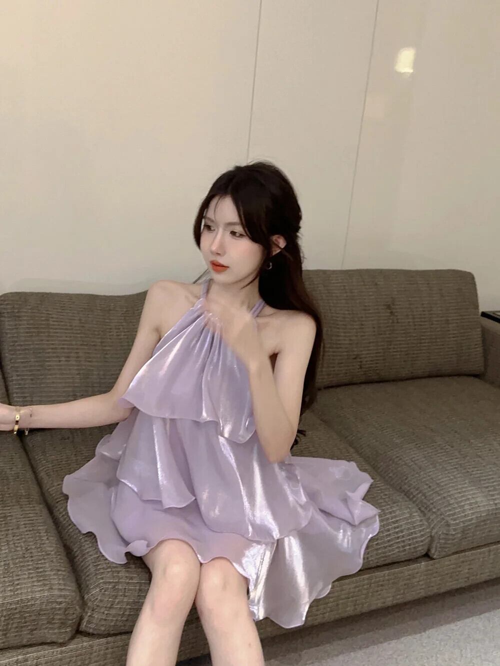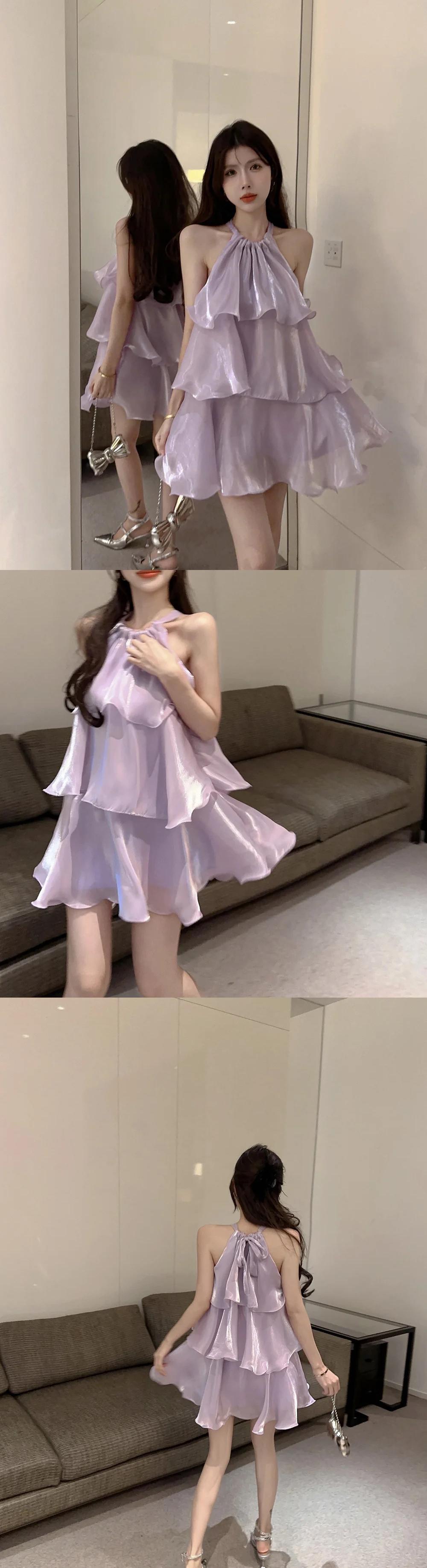 ドレス甘いノースリーブフリルメッシュルーズサマーケーキミニドレスセクシー妖精 ラッフル 大人ガーリー スウィート キュート カジュアル 夏物 ソリッドカラー