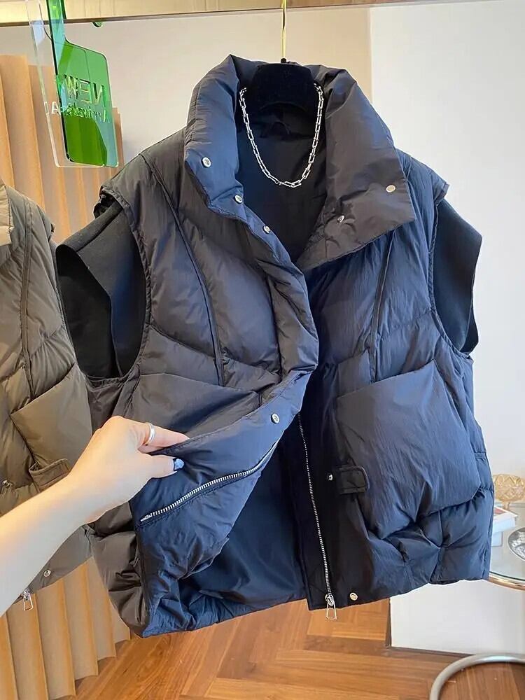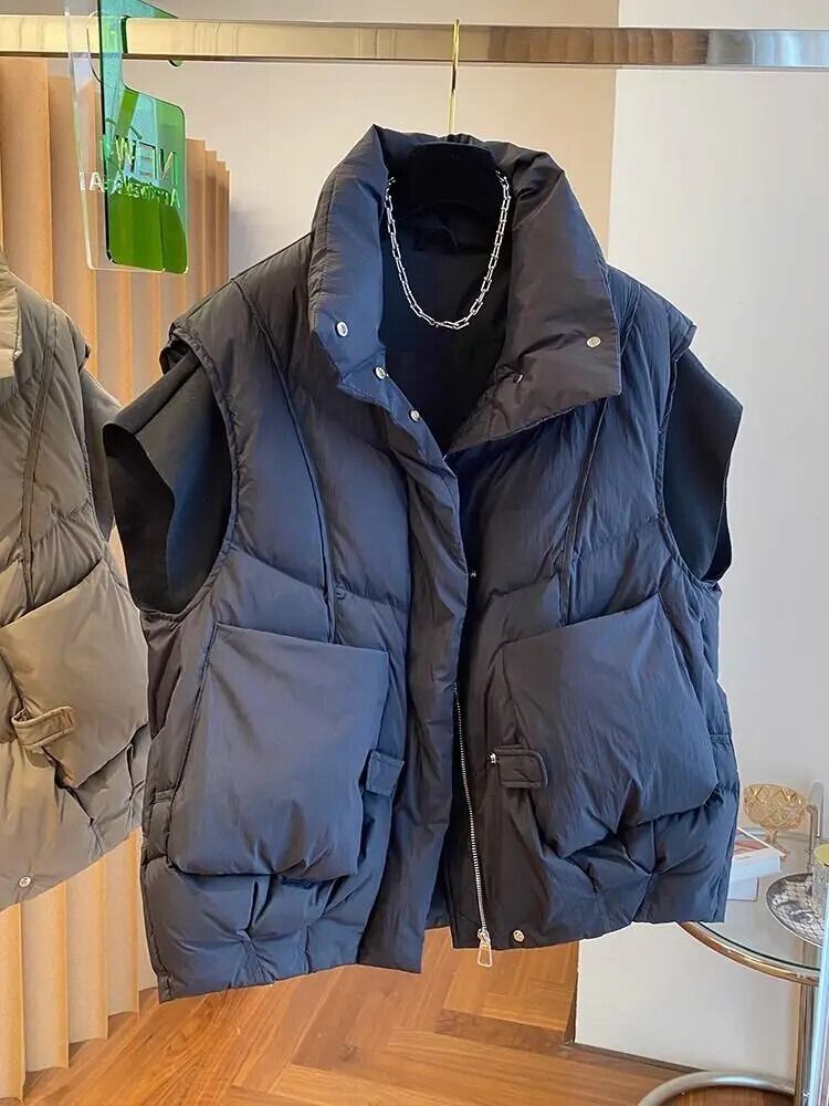 暖かい秋冬ショートベストコートポケットノースリーブジャケットチョッキパーカーダウン オータム 秋物 ウィンター 冬物 ソリッドカラー