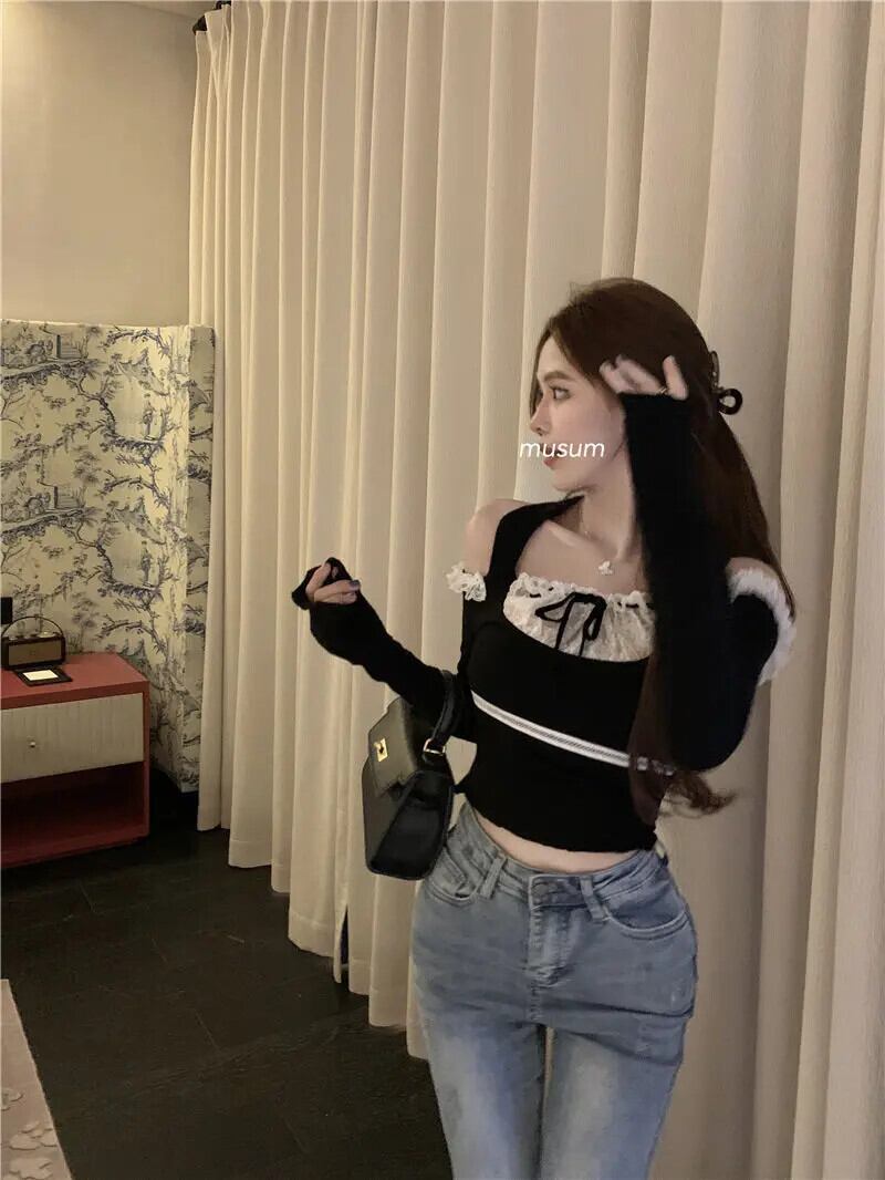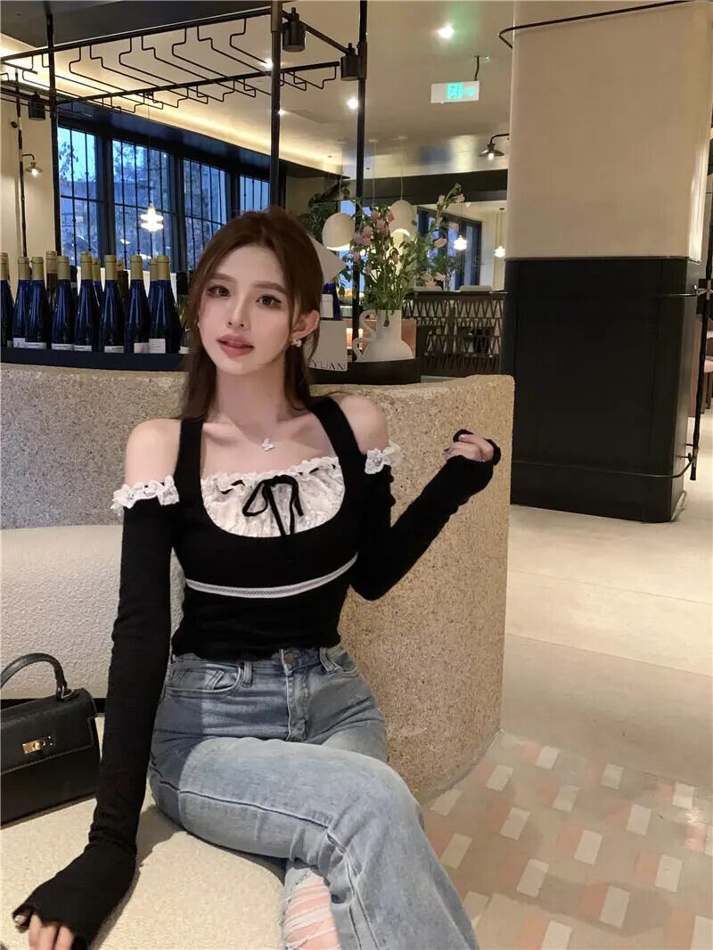 シャツセクシースリムホルター Ropa グラフィック Tシャツ Y2k トップレースシャツ美的グランジ黒 Tシャツ ブラック