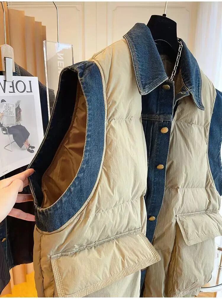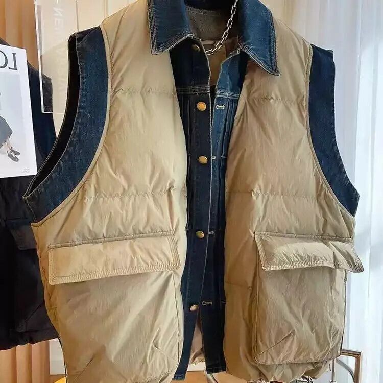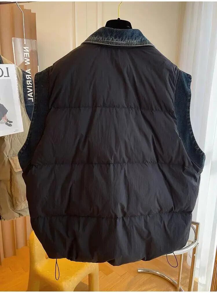 ダウンコートデニムシャツパッチワーク偽 2 黒ベスト Y2k チョッキ Chaleco コットントップパーカージャケットユニセックス ブラック