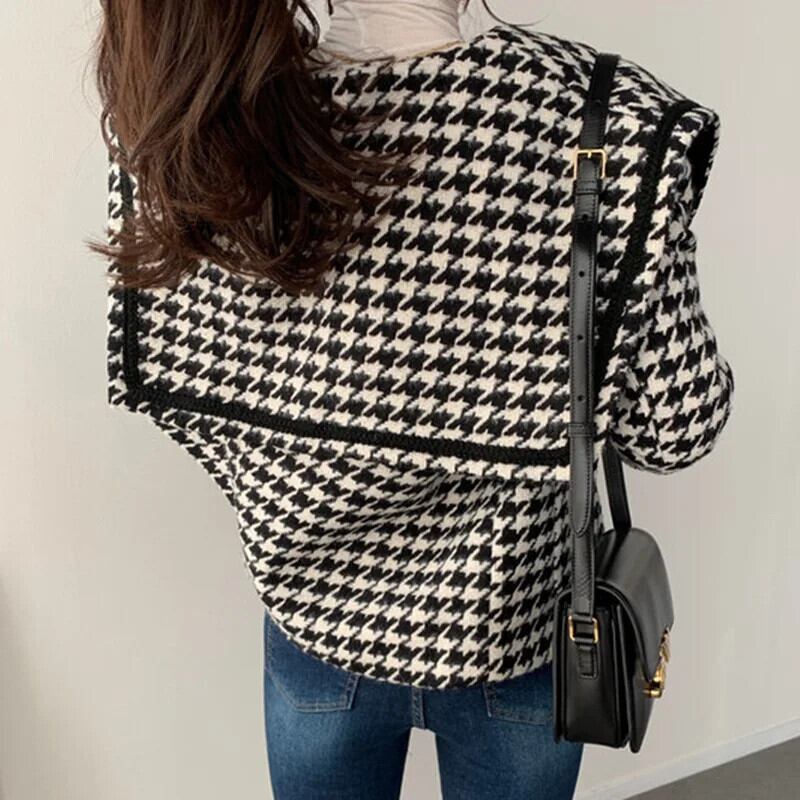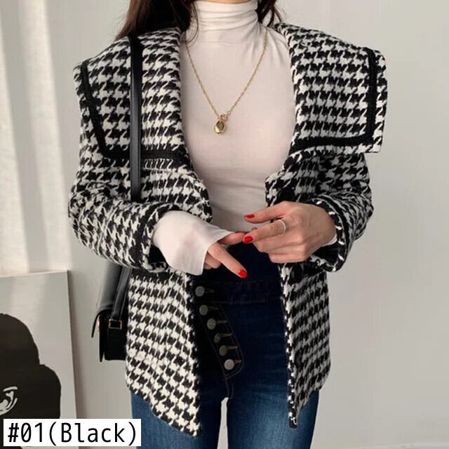 キルティングテーラードコート秋ネイビー襟ルーズカーディガン長袖千鳥チェック柄ウールコート黒トップ ロング レッド ブラック オータム 秋物