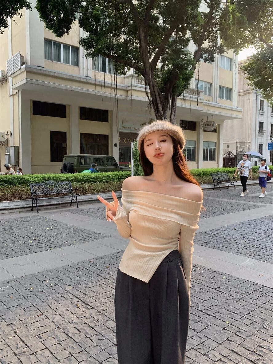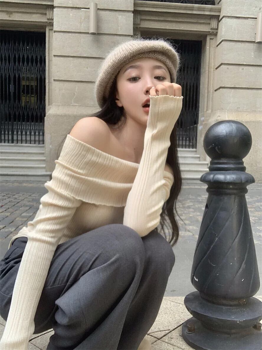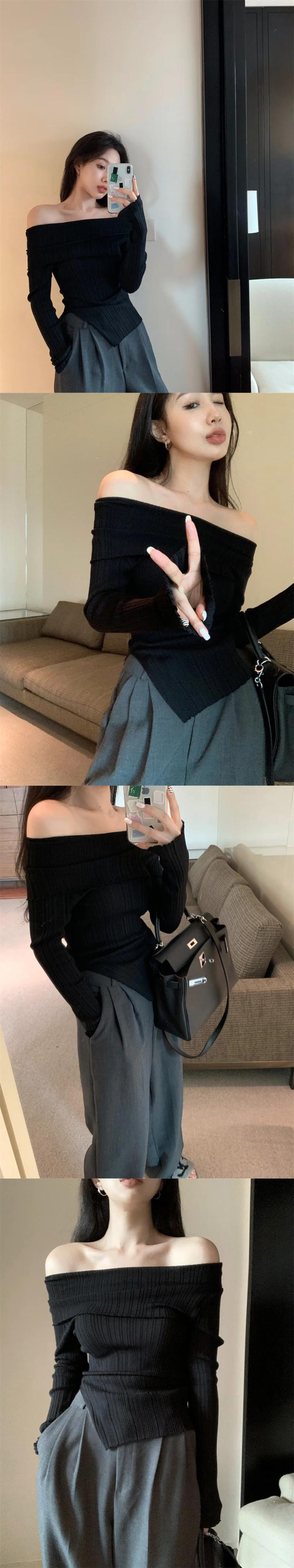 シャツセーターレトロ不規則薄いニットスリムプルオーバーショルダートップオフセーターブラック