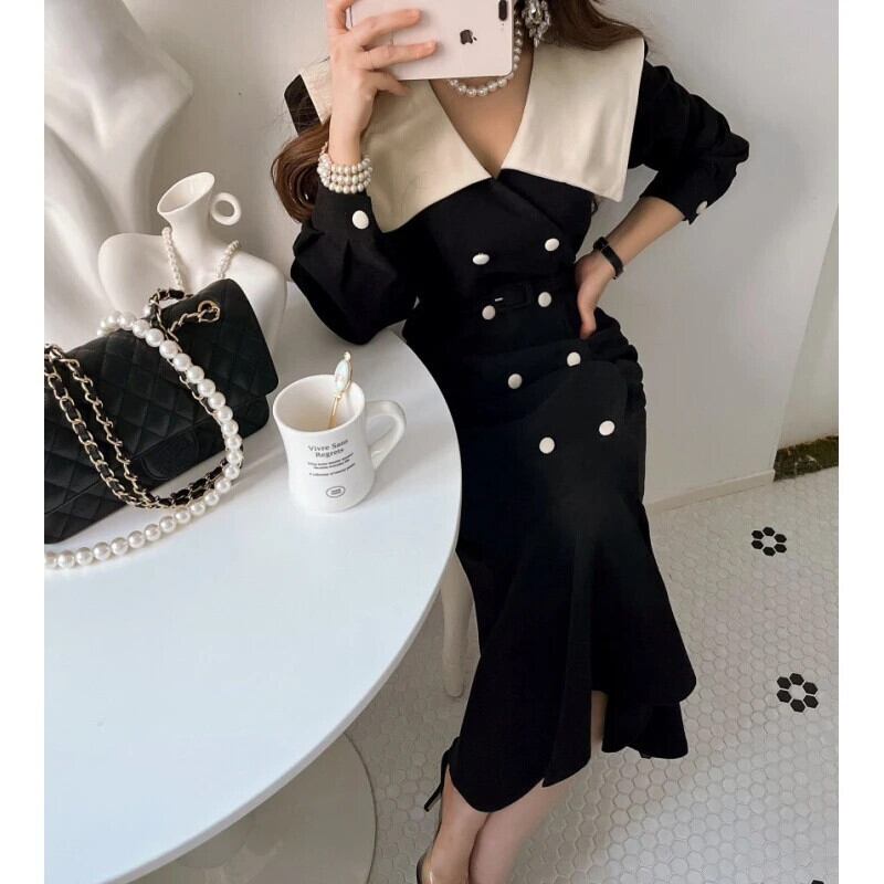 黒フィッシュテールターンダウン襟コントラストパッチワークローブ Vestidos 長袖ダブルブレストスリムドレス ロング ブラック
