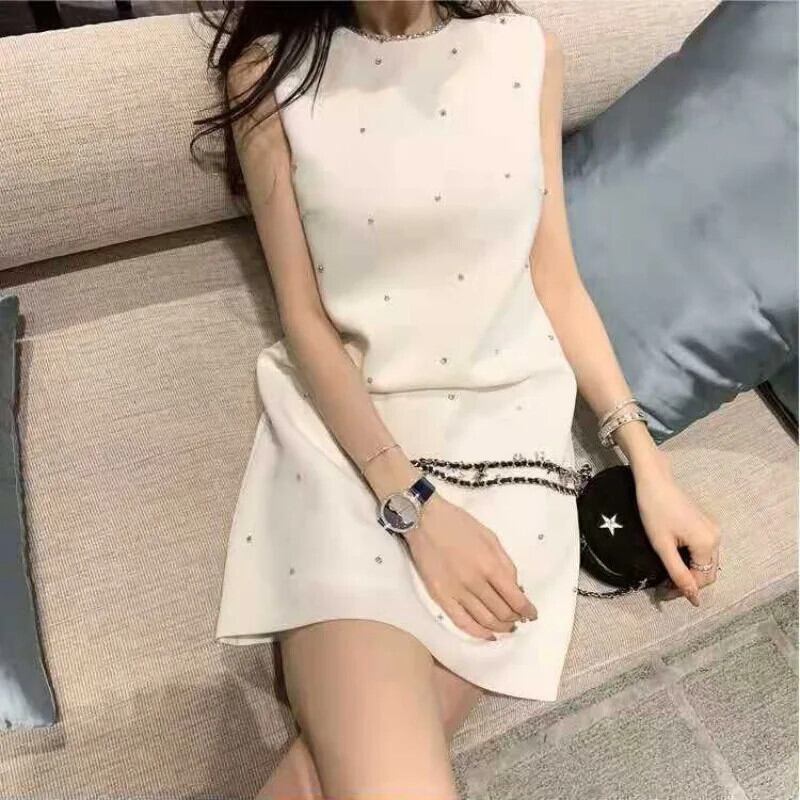 気質サマータンクホワイトブラックヘビーワークビーズウォーターダイヤモンドドレスストレートAラインVestidosデ 夏物