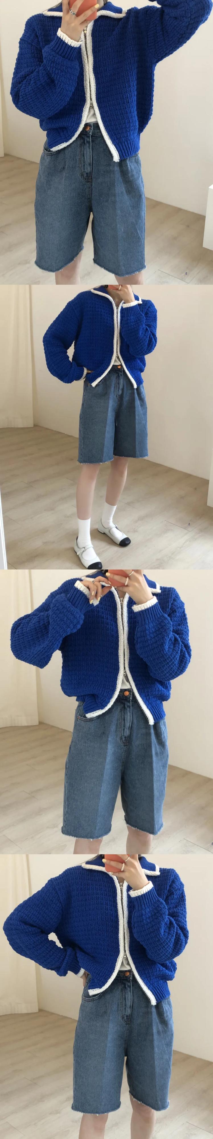 シックコントラストターンダウン襟ダブルジップカーディガンワッフルルーズセーターニットカーディガンコートセータープル