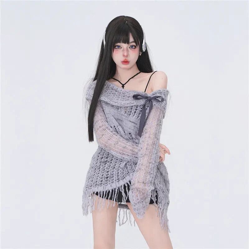 アウト パースペクティブ セーター グレー ボウ セーター ジャージ オフショルダー テル トップ セーター Y2k ホール ジャンパー ニット グランジ セクシー リボン