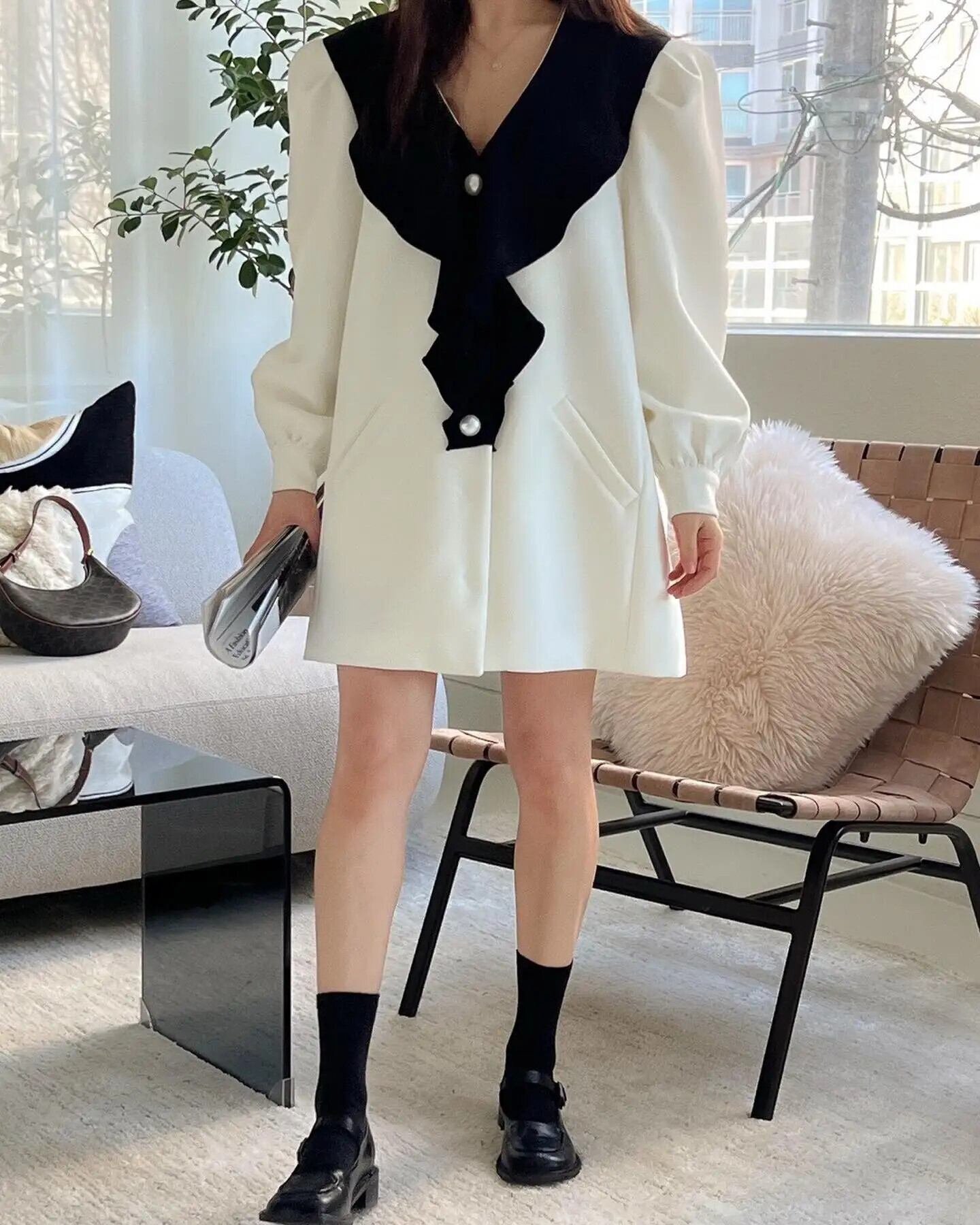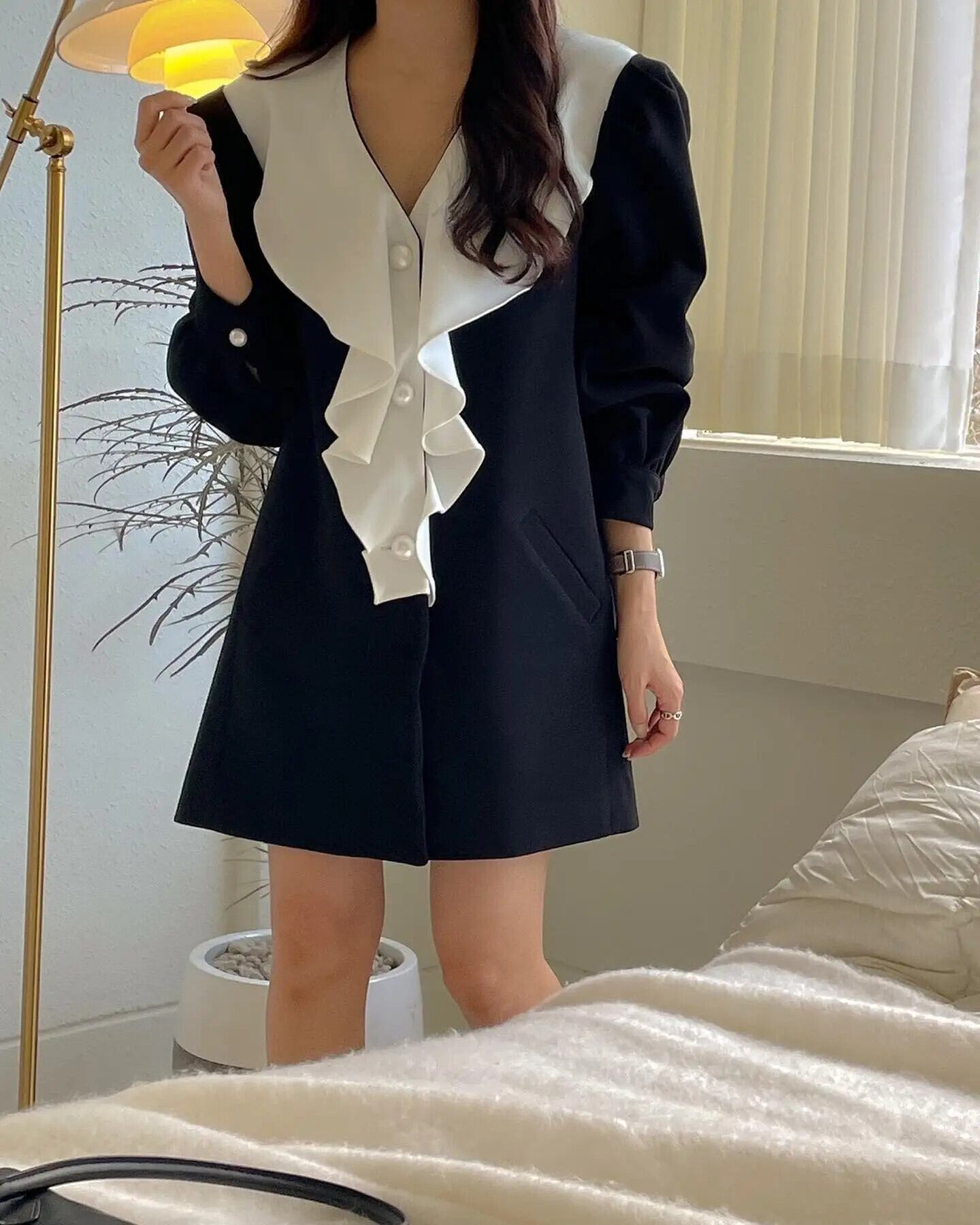 Vestidos デシック春レトロコントラストフリル襟パールボタンルーズスリーブブラックドレスミニ スプリング 春物 真珠