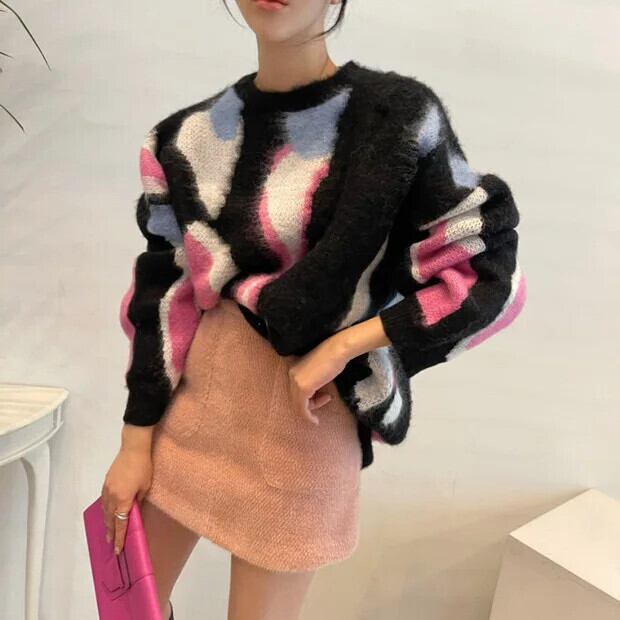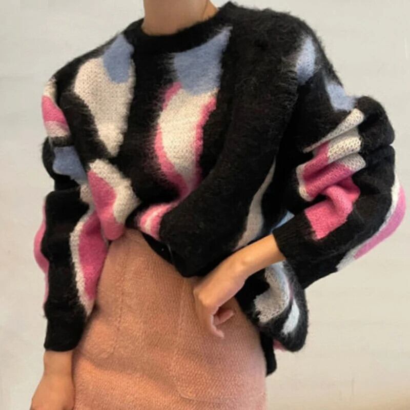 セータープルオーバー緩い暖かいコントラストセーターニットトップ Y2k フェアリーコア美学グランジモヘアレトロトップ