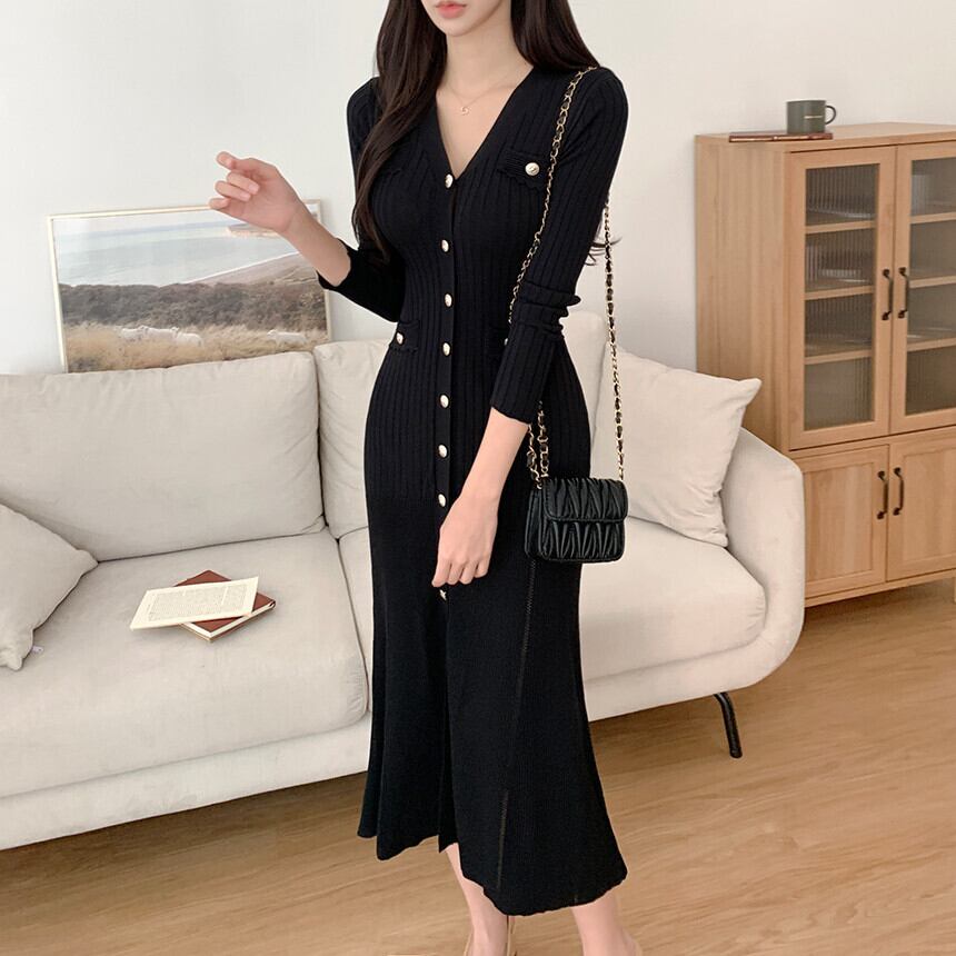 黒スリムニットロングドレスシングルブレスト V ネック袖スプリットドレス Vestidos ローブ ブラック Vネック