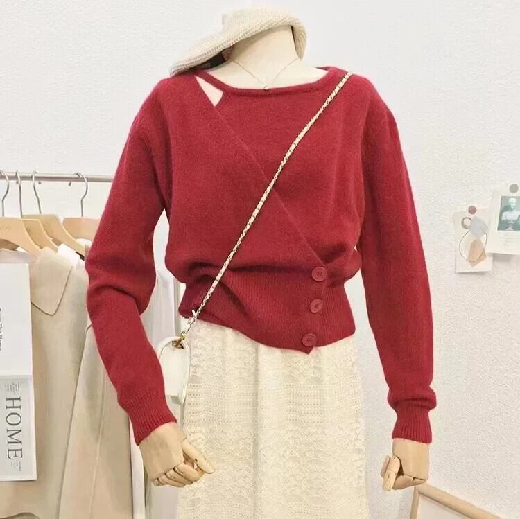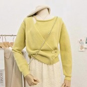 セクシー非対称シングルボタンセーター秋ピンクすべて一致ニットトップス長袖底プルオーバー偽 2 ロング オータム 秋物